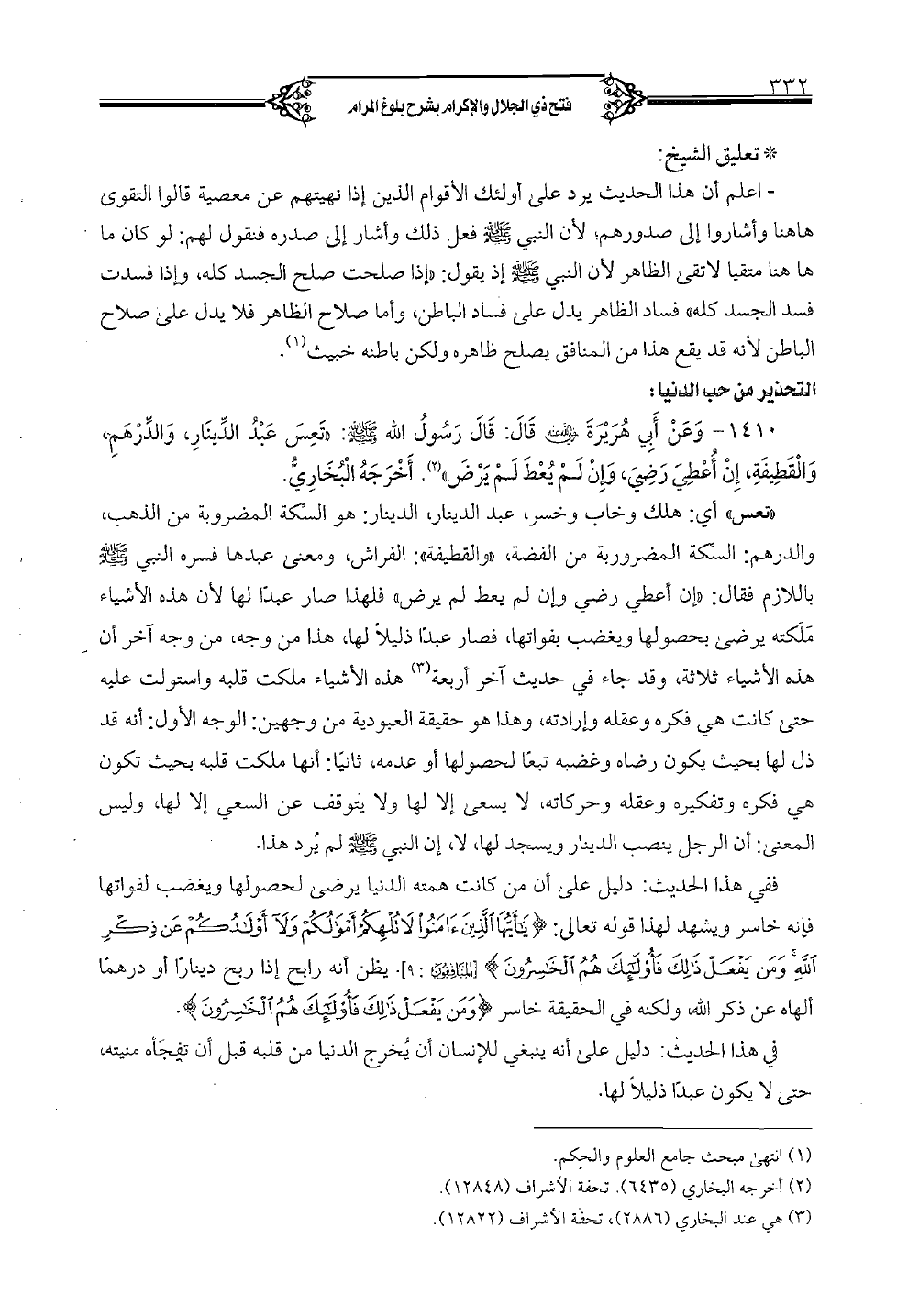 1410 - وعن أبي هريرة (رضي الله عنه) قال: قال رسول الله (صلى الله عليه وسلم): «تعس عبد الدينار، والدرهم، والقطيفة، إن أعطي رضي، وإن لم يعط لم يرض». أخرجه البخاري. «تعس» أي: هلك وخاب وخسر، عبد الدينار، الدينار: هو السكة المضروبة من الذهب، والدرهم: السكة المضروربة من الفضة، «والقطيفة»: الفراش، ومعنى عبدها فسره النبي (صلى الله عليه وسلم) باللازم فقال: «إن أعطي رضي وإن لم يعط لم يرض» فلهذا صار عبداً لها لأن هذه الأشياء ملكته يرضى بحصولها ويغضب بفواتها، فصار عبداً ذليلاً لها، هذا من وجه، من وجه آخر أن هذه الأشياء ثلاثة، وقد جاء في حديث آخر أربعة هذه الأشياء ملكت قلبه واستولت عليه حتى كانت هي فكره وعقله وإرادته، وهذا هو حقيقة العبودية من وجهين: الوجه الأول: أنه قد ذل لها بحيث يكون رضاه وغضبه تبعاً لحصولها أو عدمه، ثانيا: أنها ملكت قلبه بحيث تكون هي فكرة وتفكيره وعقله وحركاته، لا يسعى إلا لها ولا يتوقف عن السعي إلا لها، وليس المعنى: أن الرجل ينصب الدينار ويسجد لها، لا، إن النبي (صلى الله عليه وسلم) لم يرد هذا. ففي هذا الحديث: دليل على أن من كانت همته الدنيا يرضى لحصولها ويغضب لفواتها فإنه خاسر ويشهد لهذا قوله تعالى: {يَا أَيُّهَا الَّذِينَ آمَنُوا لَا تُلْهِكُمْ أَمْوَالُكُمْ وَلَا أَوْلَادُكُمْ عَن ذِكْرِ اللَّهِ وَمَن يَفْعَلْ ذَلِكَ فَأُولَئِكَ هُمُ الْخَاسِرُونَ} [المنافقون: 9]. يظن أن رابح إذا ربح ديناراً أو درهماً ألهاه عن ذكر الله، ولكنه في الحقيقة خاسر {وَمَن يَفْعَلْ ذَلِكَ فَأُولَئِكَ هُمُ الْخَاسِرُونَ}. وفي هذا الحديث: دليل على أنه ينبغي للإنسان أن يخرج الدنيا من قلبه قبل أن تفجأه منيته، حتى لا يكون عبداً ذليلاً لها.