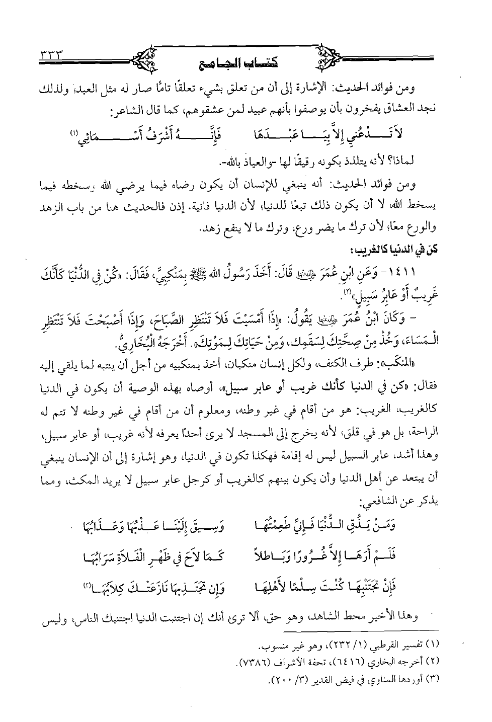 -وكان ابن عمر (رضي الله عنها) يقول: «إذا أمسيت فلا تنتظر الصباح، وإذا أصبحت فلا تنتظر المساء، وخذ من صحتك لسقمك، ومن حياتك لموتك». أخرجه البخاري. «المنكب»: طرف الكتف، ولكل إنسان منكبان، أخذ بمنكبيه من أجل أن ينتبه لما يلقي إليه فقال: «كن في الدنيا كأنك غريب أو عابر سبيل»، أوصاه بهذه الوصية أن يكون في الدنيا كالغريب، الغريب: هو من أقام في غير وطنه، ومعلوم أن من أقام في غير وطنه لا تتم له الراحة، بل هو في قلق، لأنه يخرج إلى المسجد لا يرى أحداً يعرفه لأنه غريب، أو عابر سبيل وهذا أشد، عابر السبيل ليس له إقامة فهكذا تكون في الدنيا، وهو إشارة إلى أن الإنسان ينبغي أن يبتعد عن أهل الدنيا وأن يكون بينهم كالغريب أو كرجل عابر سبيل لا يريد المكث، ومما يذكر عن الشافعي: