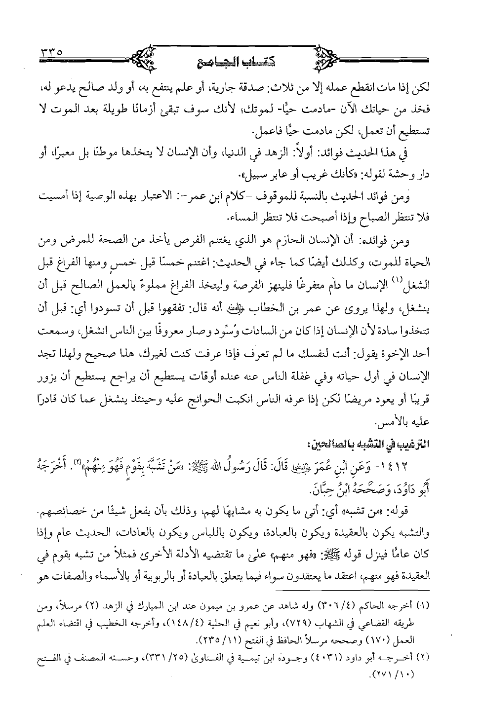 1412 - وعن ابن عمر (رضي الله عنه) قال: قال رسول الله (صلى الله عليه وسلم): «من تشبه بقوم فهو منهم». أخرجه أبو داود، وصححه ابن حبان. قوله: «من تشبه» أي: أتى ما يكون به متشابهاً لهم، وذلك بأن يفعل شيئاً من خصائصهم. والتشبه يكون بالعقيدة ويكون بالعبادة، ويكون باللباس ويكون بالعادات، الحديث عام وإذا كان عاماً فينزل قوله (صلى الله عليه وسلم): «فهو منهم» على ما تقتضيه الأدلة الأخرى فمثلا من تشبه بقوم في العقيدة فهو منهم، اعتقد ما يعتقدون سواء فيما يتعلق بالعبادة أو بالربوبية أو بالأسماء والصفات هو