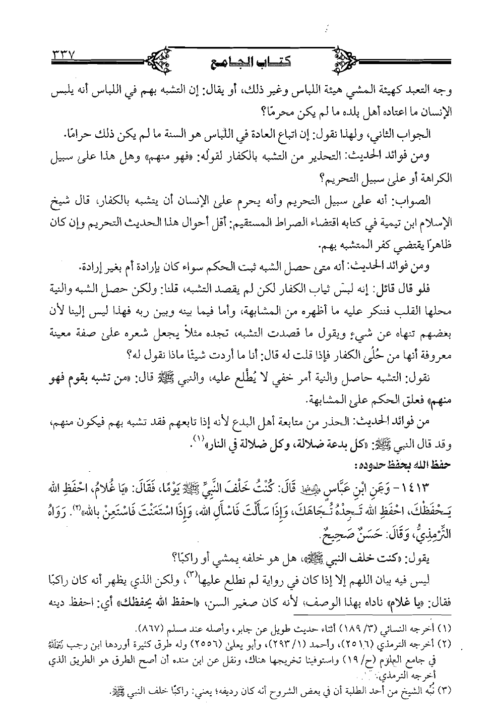 1413 - وعن ابن عباس (رضي الله عنه) قال: كنت خلف النبي (صلى الله عليه وسلم) يوماً، فقال: «يا غلام، أحفظ الله يحفظك، أحفظ الله تجده تجاهك، وإذا سألت فاسأل الله، وإذا استعنت فاستعن بالله». رواه الترمذي، وقال: حسن صحيح. يقول: «كنت خلف النبي (صلى الله عليه وسلم)»، هل هو خلفه يمشي أو راكباً؟ ليس فيه بيان اللهم إلا إذا كان في رواية لم نطلع عليها، ولكن الذي يظهر أنه كان راكباً فقال: «يا غلام» ناداه بهذا الوصف، لأنه كان صغير السن، «أحفظ الله يحفظك» أي: أحفظ دينه