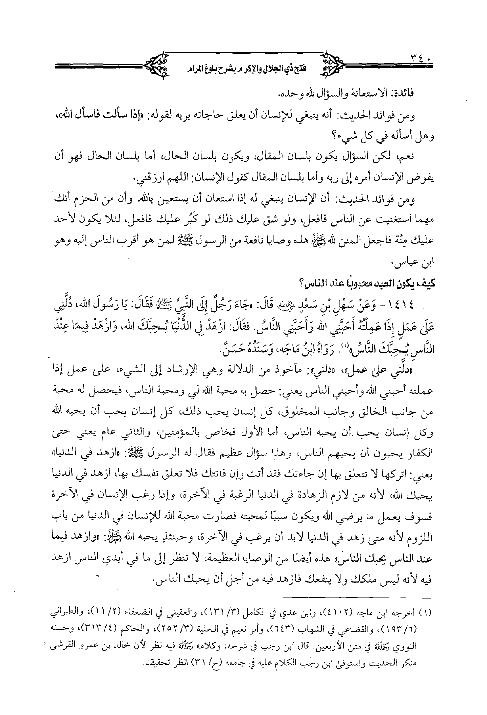 1414 - وعن سهل بن سعد (رضي الله عنه) قال: «جاء رجل إلى النبي (صلى الله عليه وسلم) فقال: يا رسول الله، دلني على عمل إذا عملته أحبني الله وأحبني الناس. فقال: أزهد في الدنيا يحبك الله، وأزهد فيما عند الناس يحبك الناس». رواه ابن ماجه، وسنده حسن. «دلني على عمل»، «دلني»: مأخوذ من الدلالة وهي الإرشاد إلى الشيء، على عمل إذا عملته أحبني الله وأحبني الناس يعني: حصل به محبة الله لي ومحبة الناس، فيحصل له محبة من جانب الخالق وجانب المخلوق، كل إنسان يحب ذلك، كل إنسان يحب أن يحبه الله وكل إنسان يجب أن يحبه الناس، أما الأول فخاص بالمؤمنين، والثاني عام يعني حتى الكفار يحبون أن يحبهم الناس، وهذا سؤال عظيم فقال له الرسول (صلى الله عليه وسلم): «أزهد في الدنيا» يعني: اتركها لا تتعلق بها إن جاءتك فقد أتت وإن فاتتك فلا تعلق نفسك بها، أزهد في الدنيا يحبك الله؛ لأنه من لازم الزهادة في الدنيا الرغبة في الآخرة، وإذا رغب الإنسان في الآخرة فسوف يعمل ما يرضي الله ويكون سبباً لمحبته فصارت محبة الله للإنسان في الدنيا من باب اللزوم لأنه متى زهد في الدنيا لابد أن يرغب الآخرة، وحينئذ يحبه الله (عز وجل): «وأزهد فيما عند الناس يحبك الناس» هذه أيضا من الوصايا العظيمة، لا تنظر إلى ما في أيدي الناس أزهد فيه لأنه ليس ملكك ولا ينفعك فأزهد فيه من أجل أن يحبك الناس.