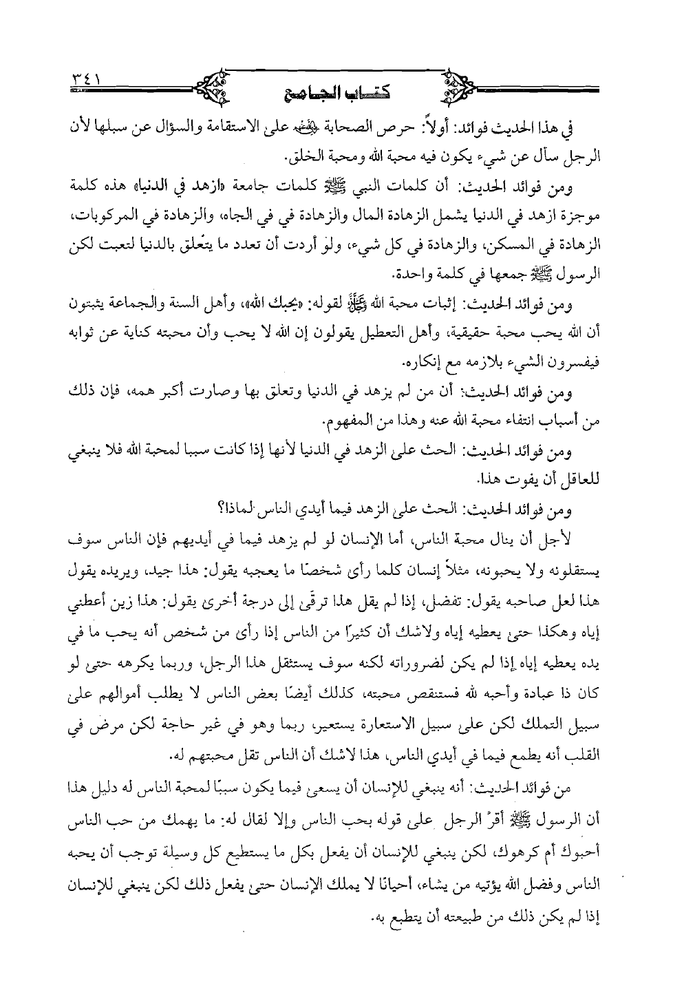 لأجل أن ينال محبة الناس، أما الإنسان لو لم يزهد فيما في أيديهم فإن الناس سوف يستقلونه ولا يحبونه، مثلاً إنسان كلما رأى شخصاً ما يعجبه يقول: هذا جيد، ويرده يقول هذا لعل صاحبه يقول: تفضل، إذا لم يقل هذا ترقى إلى درجة أخرى يقول: هذا زين أعطني إياه وهكذا حتى يعطيه إياه ولا شك أن كثيراً من الناس إذا رأى من شخص أنه يحب ما في يده يعطيه إياه إذا لم يكن لضروراته لكنه سوف يستثقل هذا الرجل، وربما يكرهه حتى لو كان ذا عبادة وأحبه لله فستنقص محبته، كذلك ايضاً بعض الناس لا يطلب أموالهم على سبيل التملك لكن على سبيل الاستعارة يستعير، ربما وهو في غير حاجة لكن مرض في القلب أنه يطمع فيما في أيدي الناس، هذا لا شك أن الناس تقل محبتهم له.