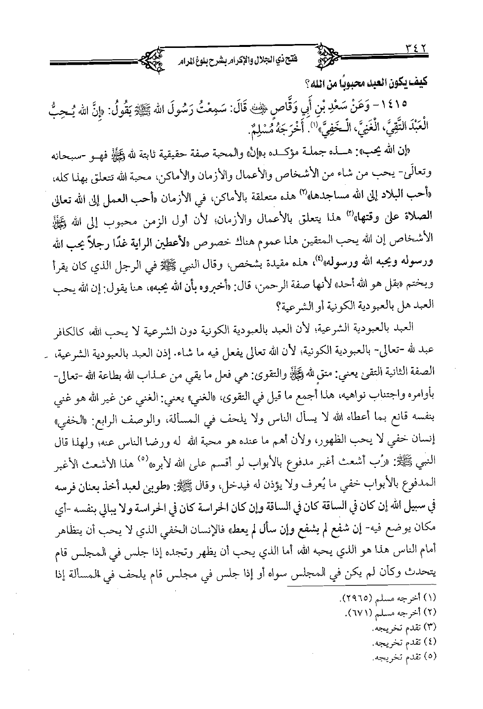 العبد بالعبودية الشرعية؛ لأن العبد بالعبودية الكونية دون الشرعية لا يحب الله، كالكافر عبد الله -تعالى- بالعبودة الكونية؛ لأن الله تعالى يفعل فيه ما شاء. إذن العبد بالعبودية الشرعية، الصفة الثانية التقي يعني: متق لله عز وجل والتقوى: هي فعل ما يقي من عذاب الله بطاعة الله -تعالى- بأوامره واجتناب نواهيه، هذا أجمل ما قيل في التقوى، "الغ ني" يعني: الغني عن غير الله هو غني بنفسه قانع بما أعطاه الله لا يسأل الناس ولا يلحف في المسألة، والوصف الرابع: "الخفي" إنسان خفي لا يحب الظهور، ولأن أهم ما عنده هو محبة الله له ورضا الناس عنه؛ ولهذا قال النبي صلى الله عليه وسلم: "رُب أشعث أغبر مدفوع بالأبواب لو أقسم على الله لأبره" هذا الأشعث الأغبر المدفوع بالأبواب خفي ما يُعرف ولا يؤذن له فيدخل، وقال صلى الله عليه وسلم: "طوبى لعبد أخذ بعنان فرسه في سبيل الله إن كان في الساقة كان في الساقة وإن كان الحراسة كان في الحراسة ولا يبالي بنفسه -أي مكان يوضع فيه- إن شفع لم يشفع وإن سأل لم يعط" فالإنسان الخفي الذي لا يحب أن يتظاهر أمام الناس هذا هو الذي يحبه الله، أما الذي يحب أن يظهر وتجده إذا جلس في المجلس قام يتحدث وكأن لم يكن في المجلس سواه أو إذا جلس في مجلس قام يلحف في المسألة إذا