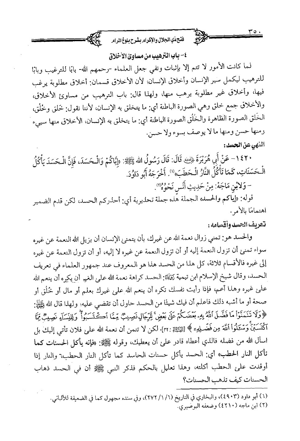 1420 - عن أبي هريرة رضي الله عنه قال: قال رسول الله صلى الله عليه وسلم: "إياكم والحسد، فإن الحسد يأكل الحسنات، كما تأكل الناء الحطب". أخرجه أبو داود.