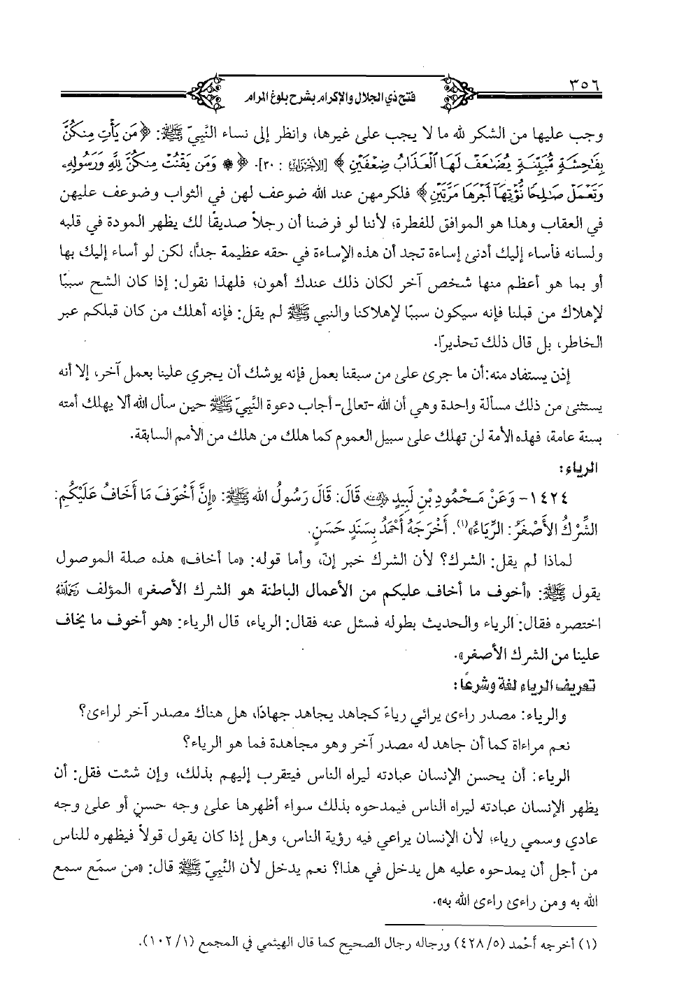 1424 - وعن محمود بن لبيدٍ رضي الله عنه قال: قال رسول الله صلى الله عليه وسلم: "إن أخوف ما أخاف عليكم: الشرك الأصغر: الرياء". أخرجه أحمد بسندٍ حسنٍ.