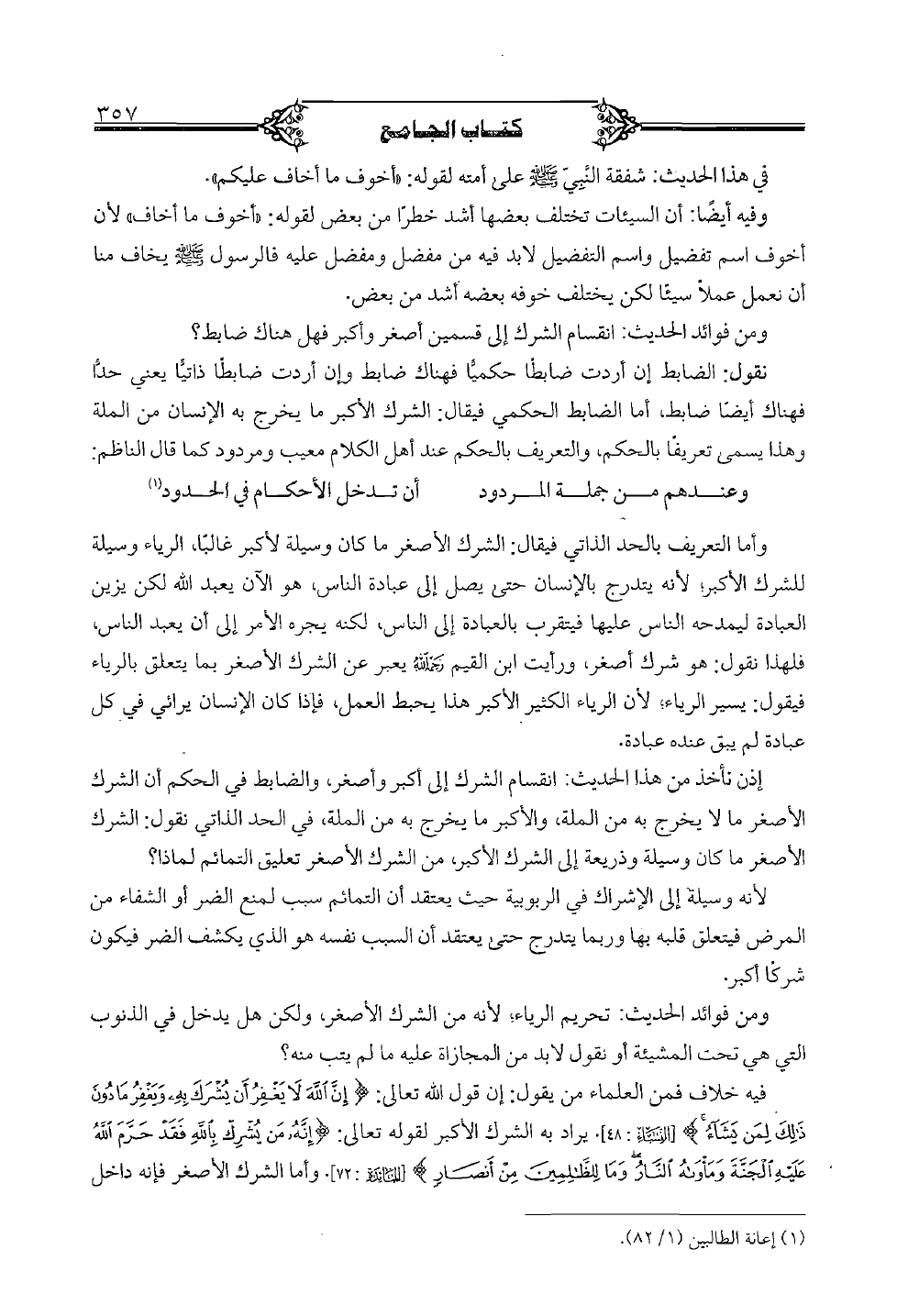إذن نأخذ من هذا الحديث: انقسام الشرك إلى أكبر وأصغر، والضابط في الحكم أن الشرك الأصغر ما لا يخرج به من الملة، والأكبر ما يخرج به من الملة، في الحد الذاتي نقول: الشرك الأصغر ما كان وسيلة وذريعة إلى الشرك الأكبر، من الشرك الأصغر تعليق التمائم لماذا؟