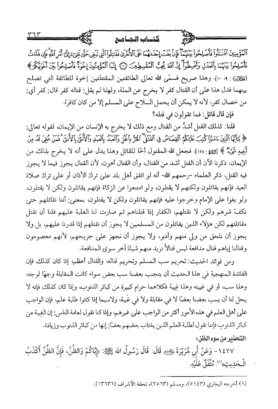 المؤمنين اقتتلوا فأصلحوا بينهما فإن بغت إحداهما على الأخرى فقاتلوا التي تبغي حتى تفيء إلى أمر الله فإن فاءت فأصلحوا بينهما بالعدل وأقسطوا إن الله يحب المقسطين * إنما المؤمنون إخوة فأصلحوا بين أخويكم} [الحجرات: 9، 10]. وهذا صريح فسمى الله تعالى الطائفتين المقتتلتين إخوة للطائفة التي تصلح بينهما فدل هذا على أن القتال كفر لا يخرج عن الملة، ولهذا لم يقل: قتاله كفر قال: كفر أي: من خصال كفر؛ لأنه لا يمكن أن يحمل السلاح على المسلم إلا من كان كافراً.