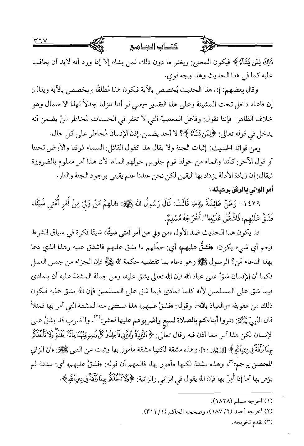 قد يكون هذا الحديث ضد الأول "من ولي من أمر أمتي شيئاً" شيئاً نكرة في سياق الشرط فيعم أي شيء يكون، "فشق عليهم" أي: حملهم ما يشق عليهم فاشقق عليه وهذا الذي دعا بهذا الدعاء من؟ الرسول صلى الله عليه وسلم وهو دعاء بما تقتضيه حكمة الله عز وجل فإن الجزاء من جنس العمل فكما أن الإنسان شق على عباد الله فإن الله تعالى يشق عليه، ومن جملة المشقة عليه أن يتمادى فيما شق على المسلمين فإن الله يشق عليه فيكون ذلك من عقوبته -والعياذ بالله-، وقوله: "فشق عليهم" هذا مستثنى منه المشقة التي أمر بها فمثلاً قال النبي صلى الله عليه وسلم: "مروا أبنائكم بالصلاة لسبعٍ واضربوهم عليها لعشر". والضرب قد يشق على الإنسان لكن هذا أمر مما أذن فيه وقال تعالى: {الزانية والزاني فاجلدوا كل واحدٍ منهما مائة جلدةٍ ولا تأخذكم بهما رأفةٌ في دين الله} [النور: 2]. وهذه مشقة لكنها مشقة مأمور بها وثبت عن النبي صلى الله عليه وسلم: "أن الزاني المحصن يرجم"، وهذه مشقة لكنها مأمور بها، فالمهم أن قوله: "فشق عليهم" أي: مشقة لم يؤمر بها أما إذا أُمر بها فإن الله يقول في الزاني والزانية: {ولا تأخذكم بهما رأفةٌ في دين الله}.