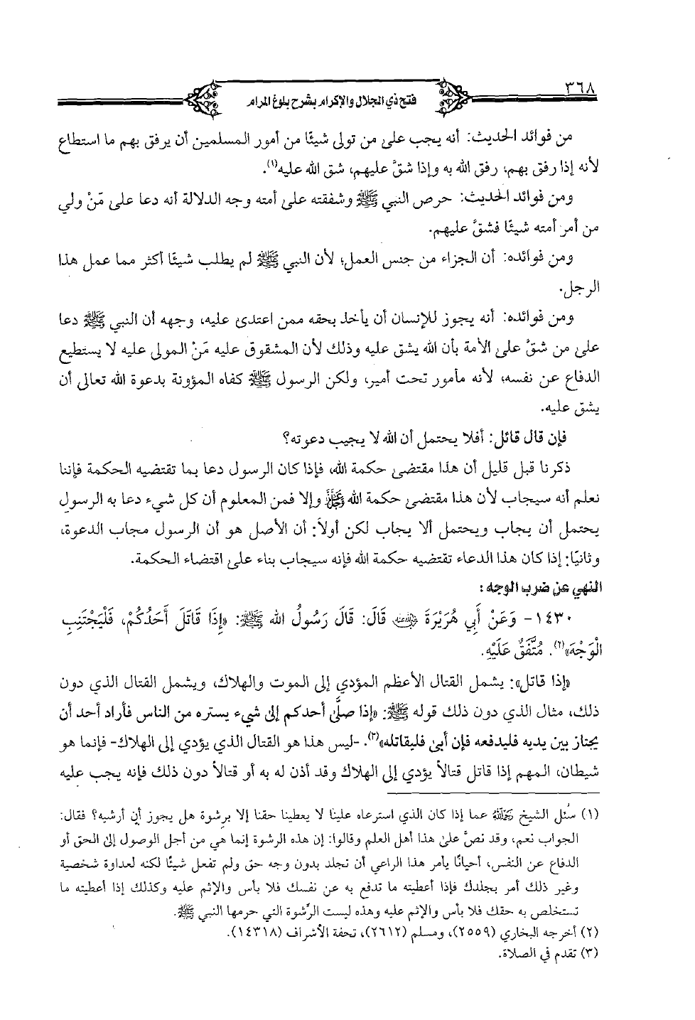1430 - وعن أبي هريرة رضي الله عنه قال: قال رسول الله صلى الله عليه وسلم: "إذا قاتل أحدكم، فليجتنب الوجه". متفق عليه.