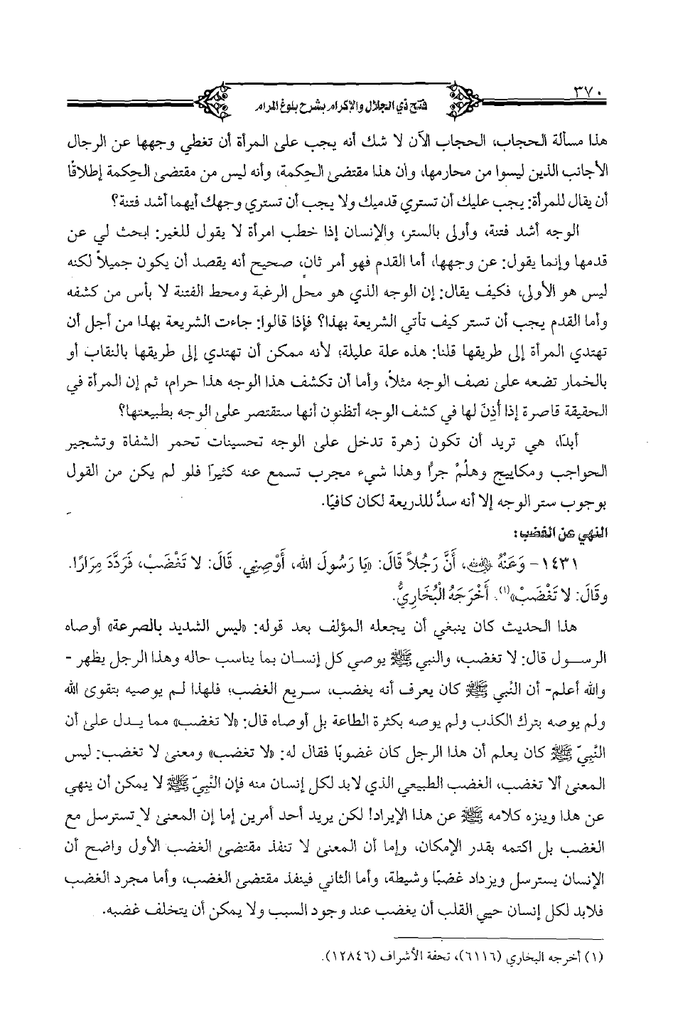 1431 - وعنه رضي الله عنه، أن رجلاً قال: "يا رسول الله، أوصني. قال: لا تغضب، فردد مراراً وقال: لا تغضب". أخرجه البخاري.