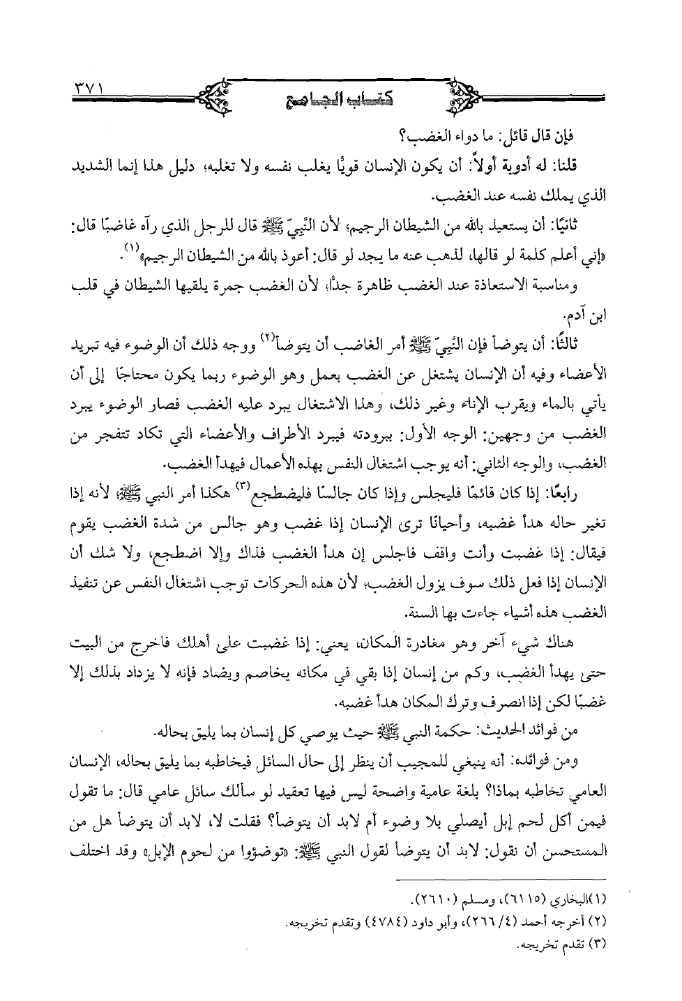 رابعاً: إذا كان قائماً فليجلس وإذا كان جالساً فليضطجع هكذا أمر النبي صلى الله عليه وسلم لأنه إذا تغير حاله هدأ غضبه، وأحياناً ترى الإنسان إذا غضب وهو جالس من شدة الغضب يقوم فيقال: إذا غضبت وأنت واقف فاجلس إن هدأ الغضب فذاك وإلا اضطجع، ولا شك أن الإنسان إذا فعل ذلك سوف يزول الغضب، لأن هذه الحركات توجب اشتغال النفس عن تنفيذ الغضب هذه أشياء جاءت بها السنة.