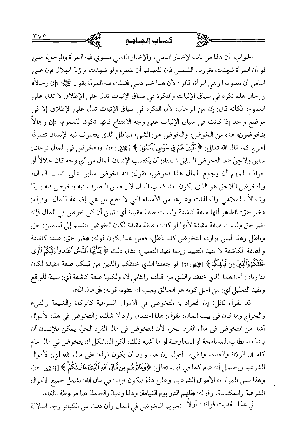 الجواب: أن هذا من باب الإخبار الديني، والإخبار الديني يستوي فيه المرأة والرجل، حتى لو أن المرأة شهدت بغروب الشمس فإن للصائم أن يفطر، ولو شهدت برؤية الهلال فإن على الناس أن يصوموا وهي امرأة، قالوا: لأن هذا خبر ديني فقبلت فيه المرأة يقول صلى الله عليه وسلم: "إن رجالاً" ورجال هذه نكرة في سياق الإثبات والنكرة في سياق الإثبات تدل على الإطلاق لا تدل على العموم، فكأنه قال: إن من الرجال، لأن النكرة في سياق الإثبات تدل على الإطلاق إلا في موضع واحد إذا كانت في سياق الإثبات على وجه الامتناع فإنها تكون للعموم، "إن رجالاً بتخوضون" هذه من الخوض، والخوض هو: الشيء الباطل الذي يتصرف فيه الإنسان تصرفاً أهوج كما قال الله تعالى: {الذين هم في خوضٍ يلعبون} [الطور: 12]. والتخوض في المال نوعان: سابق ولاحق فأما التخوض السابق فمعناه: أن يكتسب الإنسان المال من أي وجه كان حلالاً أو حراماً، المهم أن يجمع المال هذا تخوض، نقول: إنه تخوض سابق على كسب المال، والتخوض اللاحق هو الذي يكون بعد كسب المال لا يحسن التصرف فيه يتخوض فيه يميناً وشمالاً بالملاهي والملذات وغيرها من الأشياء التي لا تنفع بل هي إضاعة للمال، وقوله: "بغير حق" الظاهر أنها صفة كاشفة وليست صفة مقيدة أي: تبين أن كل خوض في المال فإنه بغير حق وليست صفة مقيدة لأنها لو كانت صفة مقيدة لكان الخوض ينقسم إلى قسمين: حق وباطل وهذا ليس بوارد، التخوض كله باطل، فعلى هذا يكون قوله: "بغير حق" صفة كاشفة والصفة الكاشفة لا تفيد التقييد وإنما تفيد التعليل، مثال ذلك {يا أيها الناس اعبدوا ربكم الذي خلقكم والذين من قبلكم} [البقرة: 21]. لو جعنا الذي خلقكم والذين من قبلكم صفة مقيدة لكان لنا ربان: أحدهما الذي خلقنا والذي من قبلنا، والثاني لا، ولكنها صفة كاشفة أي: مبنية للواقع وتفيد التعليل أي: من أجل كونه هو الخالق يجب أن تتقوه، قوله: "في مال الله".