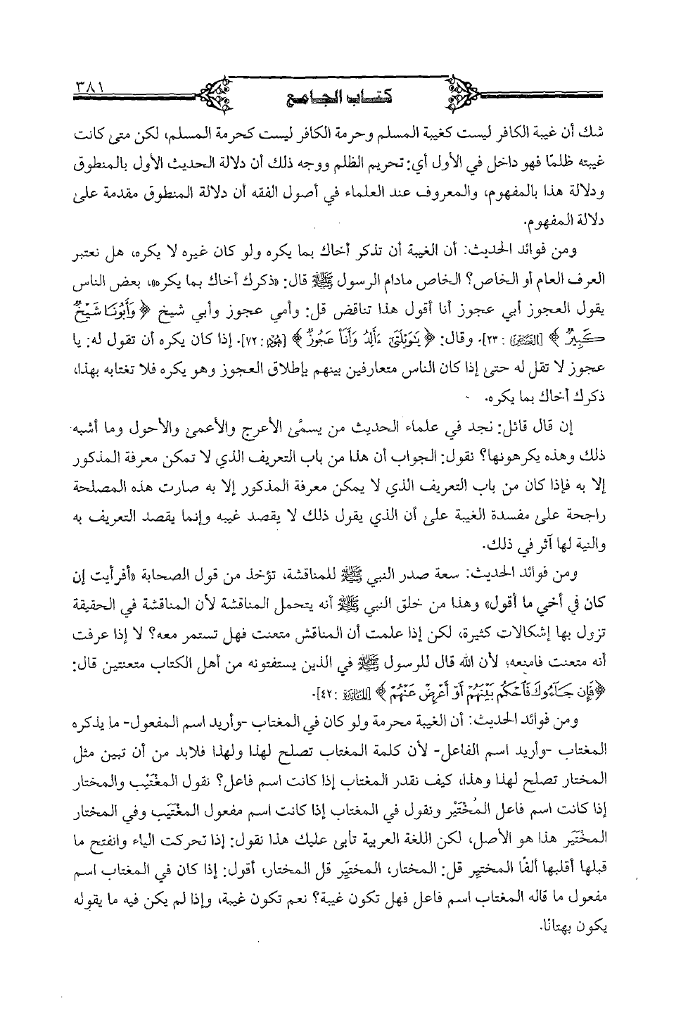 ومن فوائد الحديث: أن الغيبة أن تذكر أخاك بما يكره ولو كان غيره لا يكره، هل نعتبر العرف العام أو الخاص؟ الخاص مادام الرسول صلى الله عليه وسلم قال: "ذكرك أخاك بما يكره"، بعض الناس يقول العجوز أبي عجوز أنا أقول هذا تناقض قل: وأمي عجوز وأبي شيخ {وأبونا شيخٌ كبيرٌ} [القصص: 23]. وقال: {ياويلتي ءألد وأنا عجوزٌ} [هود: 72]. إذا كان يكره أن تقول له: يا عجوز لا تقل له حتى إذا كان الناس متعارفين بينهم بإطلاق العجوز وهو يكره فلا تغتابه بهذا، ذكرك أخاك بما يكره.