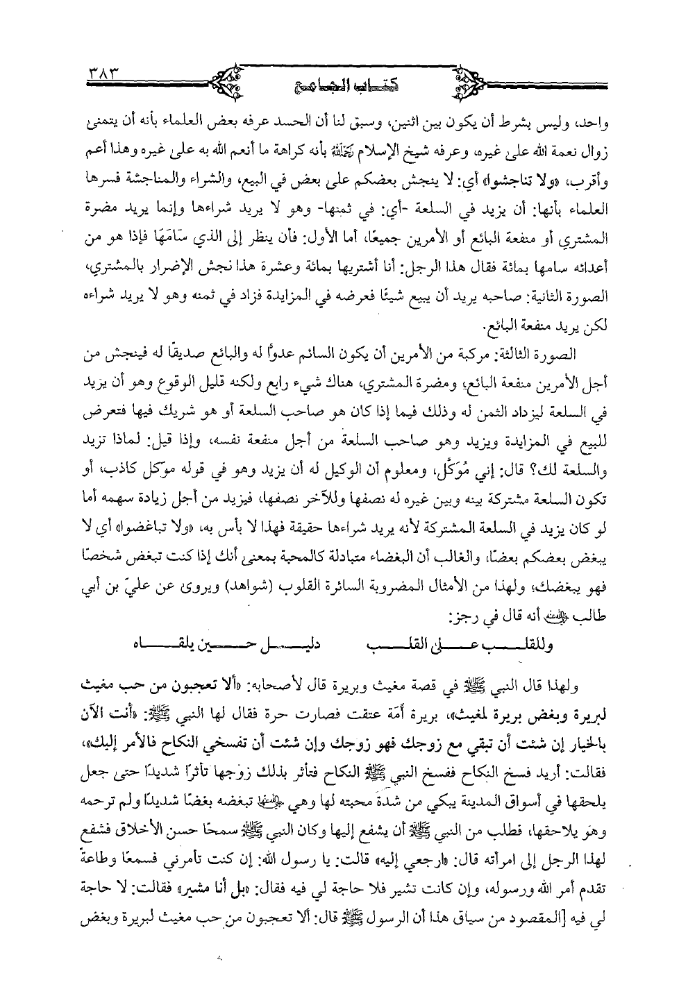 الصورة الثالثة: مركبة من الأمرين أن يكون السائم عدواً له والبائع صديقاً له فينجش من أجل الأمرين منفعة البائع، ومضرة المشتري، هناك شيء رابع ولكنه قليل الوقوع وهو أن يزيد في السلعة ليزداد الثمن له وذلك فيما إذا كان هو صاحب السلعة أو هو شريك فيها فتعرض للبيع في المزايدة ويزيد وهو صاحب السلعة من أجل منفعة نفسه، وإذا قيل: لماذا تزيد والسلعة لك؟ قال: إني موكل، ومعلوم أن الوكيل له أن يزيد وهو في قوله موكل كاذب، أو تكون السلعة مشتركة بينه وبين غيره له نصفها وللآخر نصفها، فيزيد من أجل زيادة سهمه أما لو كان يزيد في السلعة المشتركة لأنه يريد شراءها حقيقة فهذا لا بأس به، "ولا تباغضوا" أي لا يبغض بعضكم بعضاً، والغالب أن البغضاء متبادلة كالمحبة بمعنى أنك إذا كنت تبغض شخصاً فهو يبغضك، ولهذا من الأمثال المضروبة السائرة القلوب (شواهد) ويروى عن علي بن أبي طالب رضي الله عنه أنه قال في رجز: