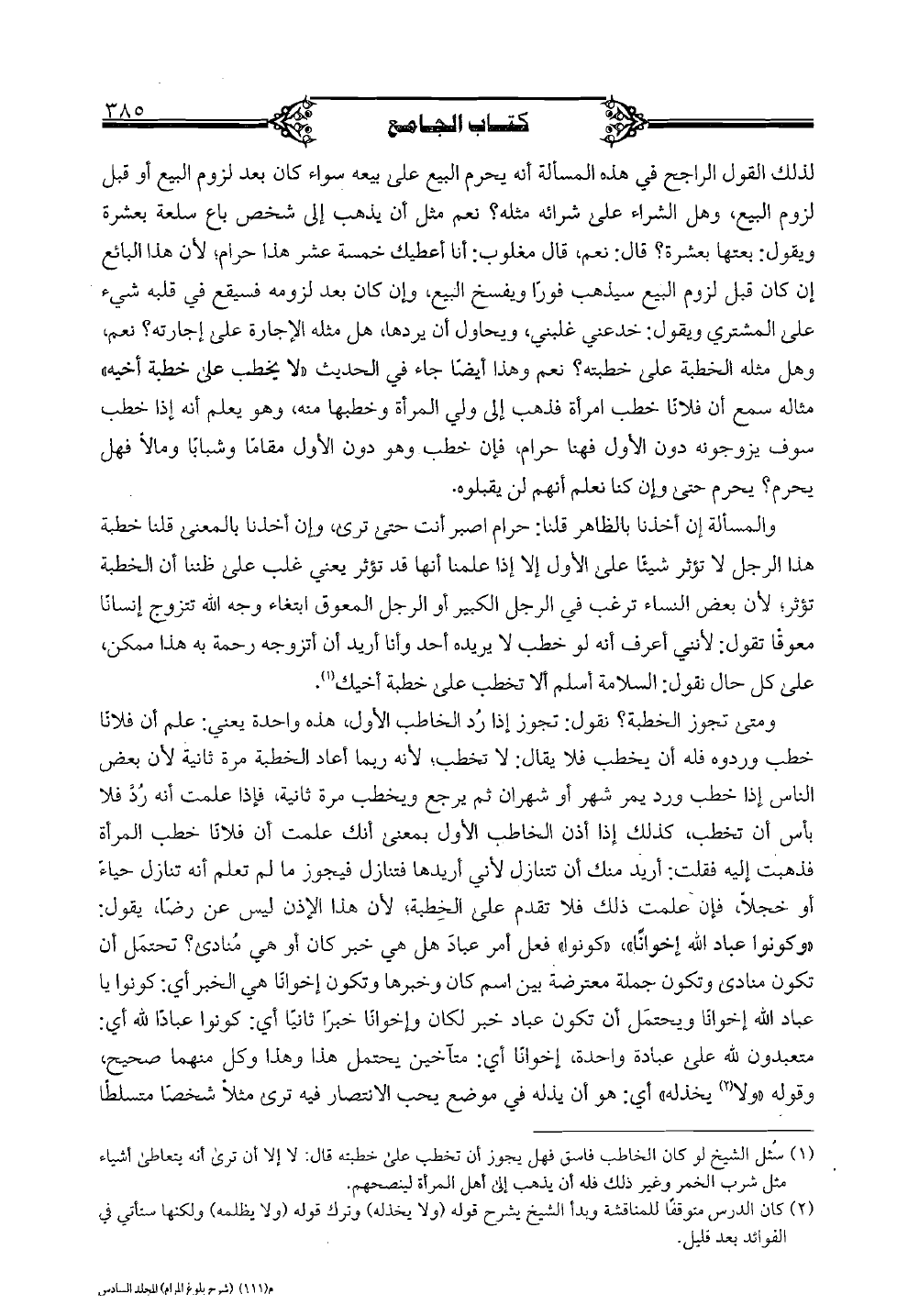 ومتى تجوز الخطبة؟ نقول: تجوز إذا رد الخاطب الأول، هذه واحدة يعني: علم أن فلاناً خطب وردوه فله أن يخطب فلا يقال: لا تخطب؛ لأنه ربما أعاد الخطبة مرة ثانية لأن بعض الناس إذا خطب ورد يمر شهر أو شهران ثم يرجع ويخطب مرة ثانية، فإذا علمت أنه رد فلا بأس أن تخطب، كذلك إذا أذن الخاطب الأول بمعنى أنك علمت أن فلاناً خطب المرأة فذهبت إليه فقلت: أريد منك أن تتنازل لأني أريدها فتنازل فيجوز ما لم تعلم أنه تنازل حياء أو خجلاً، فإن علمت ذلك فلا تقدم على الخطبة؛ لأن هذا الإذن ليس عن رضا، يقول: "وكونوا عباد الله إخواناً" "كونوا" فعل أمر عباد هل هي خبر كان أو هي منادى؟ تحتمل أن تكون منادى وتكون جملة معترضة بين اسم كان وخبرها وتكون إخواناً هي الخبر أي: كونوا يا عباد الله إخواناً ويحتمل أن تكون عباد خبر لكان وإخواناً خبراً ثانياً أي: كونوا عباداً لله أي: متعبدون لله على عبادة واحدة، إخواناً أي: متآخين يحتمل هذا وهذا وكل منهما صحيح، وقوله "لا" يخذله" أي: هو أن يذله في موضع يحب الانتصار فيه ترى مثلاً شخصاً متسلطاً