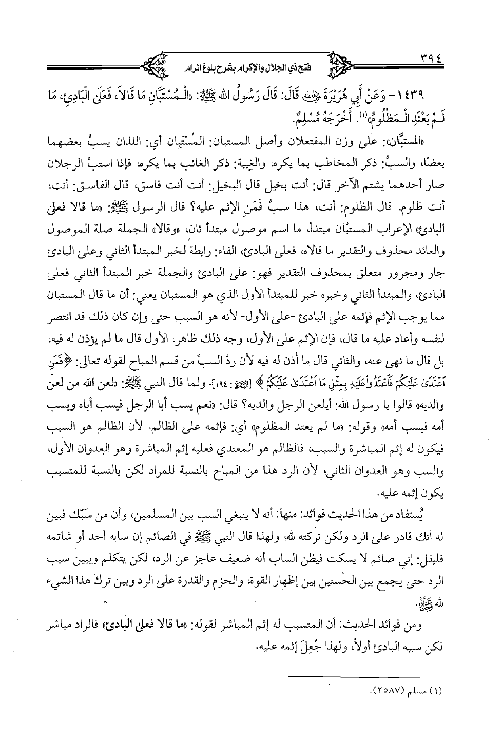 1439 - وعن أبي هريرة رضي الله عنه قال: قال رسول الله صلى الله عليه وسلم: "المستبان ما قالا، فعلى البادئ، ما لم يعتد المظلوم". أخرجه مسلمٌ.