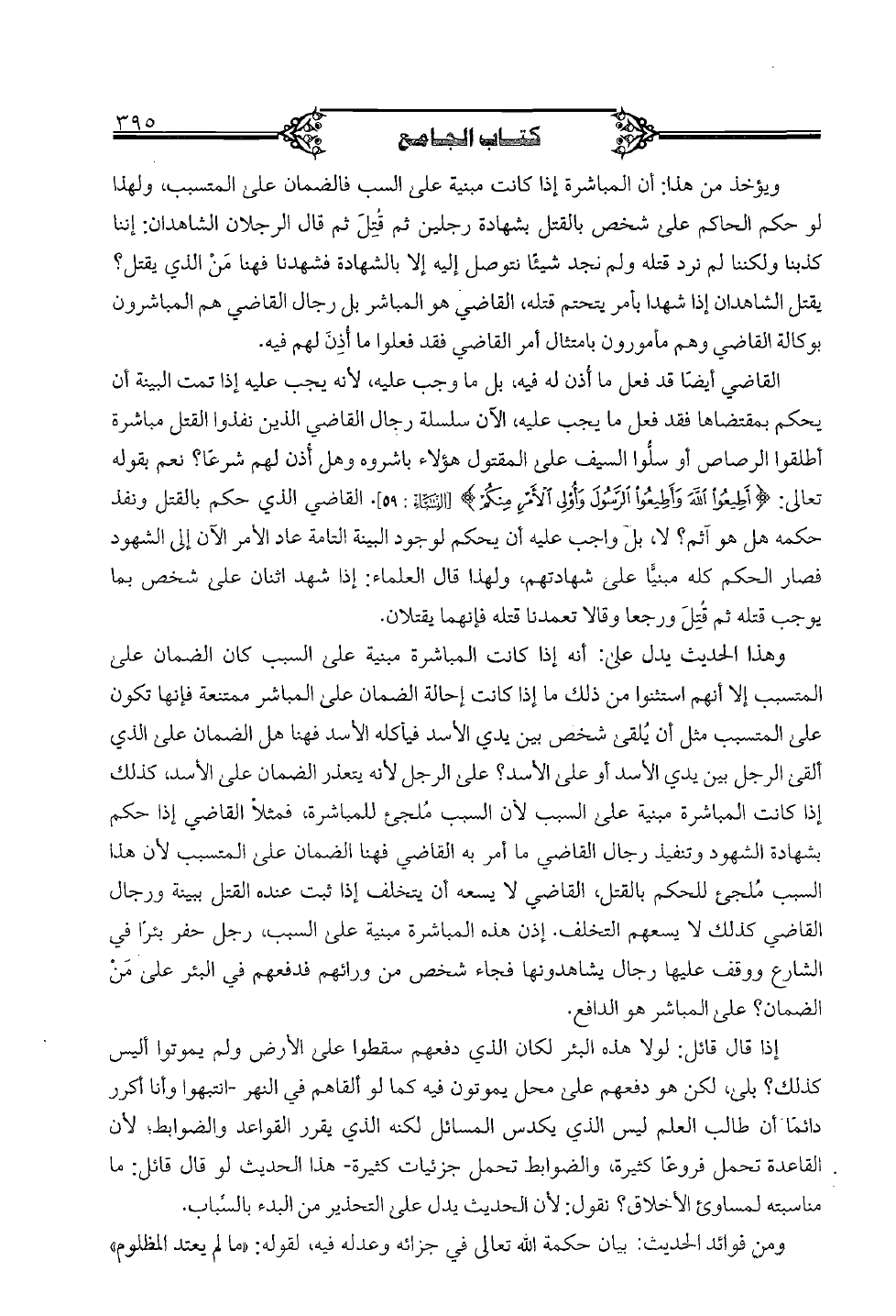 ويؤخذ من هذا: أن المباشرة إذا كانت مبنية على السب فالضمان على المتسبب، ولهذا لو حكم الحاكم على شخص بالقتل بشهادة رجلين ثم قتل ثم قال الرجلان الشاهدان: إننا كذبنا ولكننا لم نرد قلته ولم نجد شيئاً نتوصل إليه إلا بالشهادة فشهدنا فهنا من الذي يقتل؟ يقتل الشاهدان إذا شهدا بأمر يتحتم قتله، القاضي هو المباشر بل رجال القاضي هم المباشرون بوكالة القاضي وهم مأمورون بامتثال أمر القاضي فقد فعلوا ما أُذن لهم فيه.