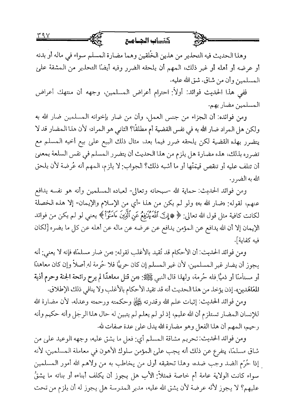 ومن فوائده: أن الجزاء من جنس العمل، وأن من ضار بإخوانه المسلمين ضار الله به ولكن هل المراد ضار الله به في نفس القضية أم مطلقاً؟ الثاني هو المراد، لأن هذا المضار قد لا يتضرر بهذه القضية لكن يلحقه ضرر فيما بعد، مثال ذلك البيع على بيع أخيه المسلم مع تضرره بذلك، هذه مضارة هل يلزم من هذا الحديث أن يتضرر المسلم في نفس السلعة بمعنى أن تتلف عليه أو تنقص قيمتها أو ما أشبه ذلك؟ الجواب: لا يلزم، المهم أنه عرضة لأن يلحق الله به الضرر.