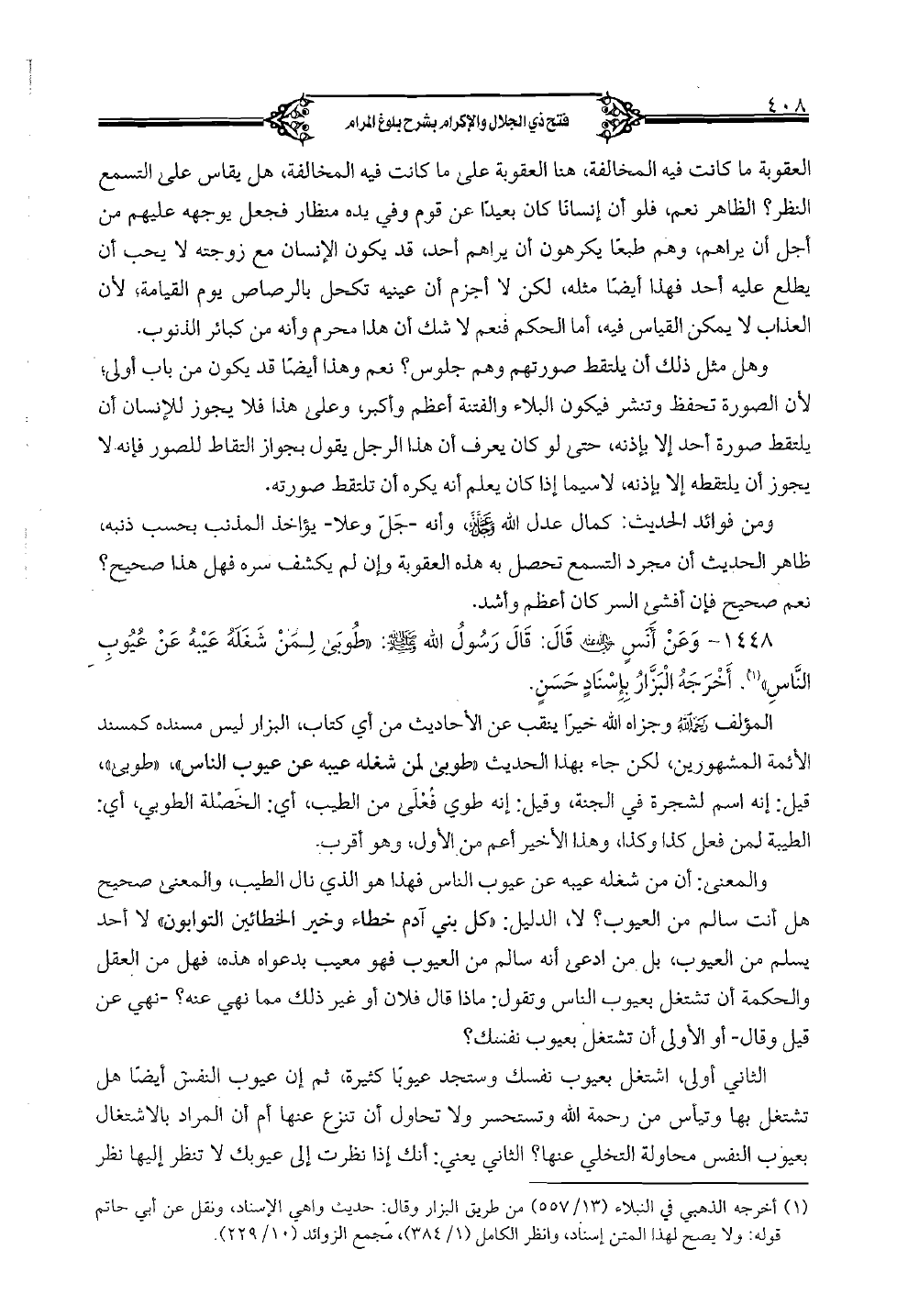 1448 - وعن أنس رضي الله عنه قال: قال رسول الله صلى الله عليه وسلم «طوبى لمن شغله عيبه عن عيوب الناس» أخرجه البزار بإسناد حسن.