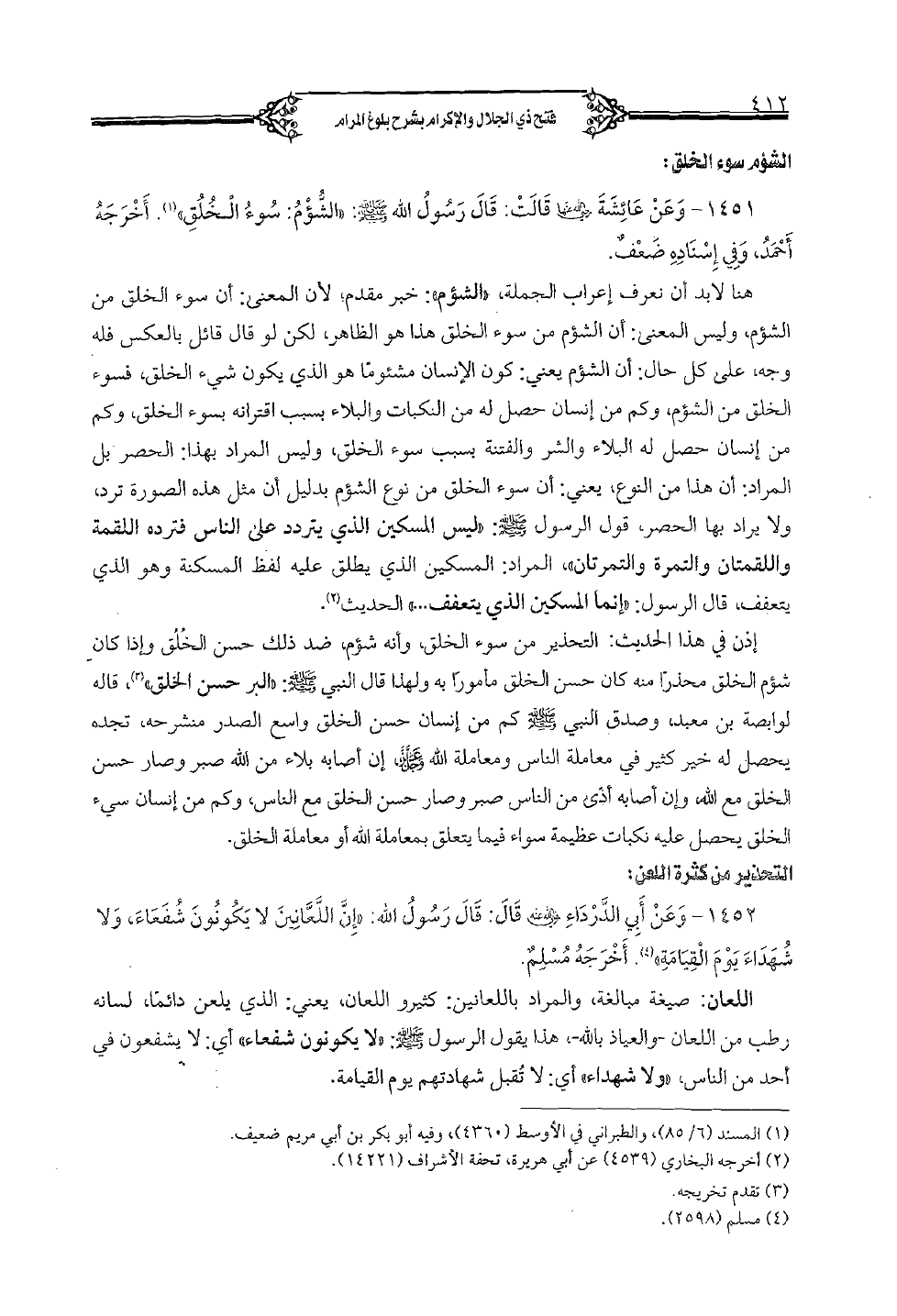 1451 - وعن عائشة رضي الله عنها قالت: قال رسول الله صلى الله عليه وسلم: «الشؤم سوء الخلق». أخرجه أحمد، وفي إسناده ضعف.