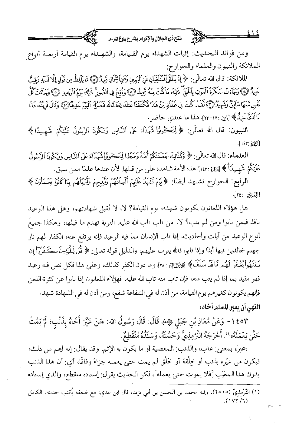 1453 - وعن معاذ بن جبل رضي الله عنه قال: قال رسول الله صلى الله عليه وسلم: «من عير أخاه بذنب لم يمت حتى يعمله» أخرجه الترمذي وحسنه، وسنده منقطع.