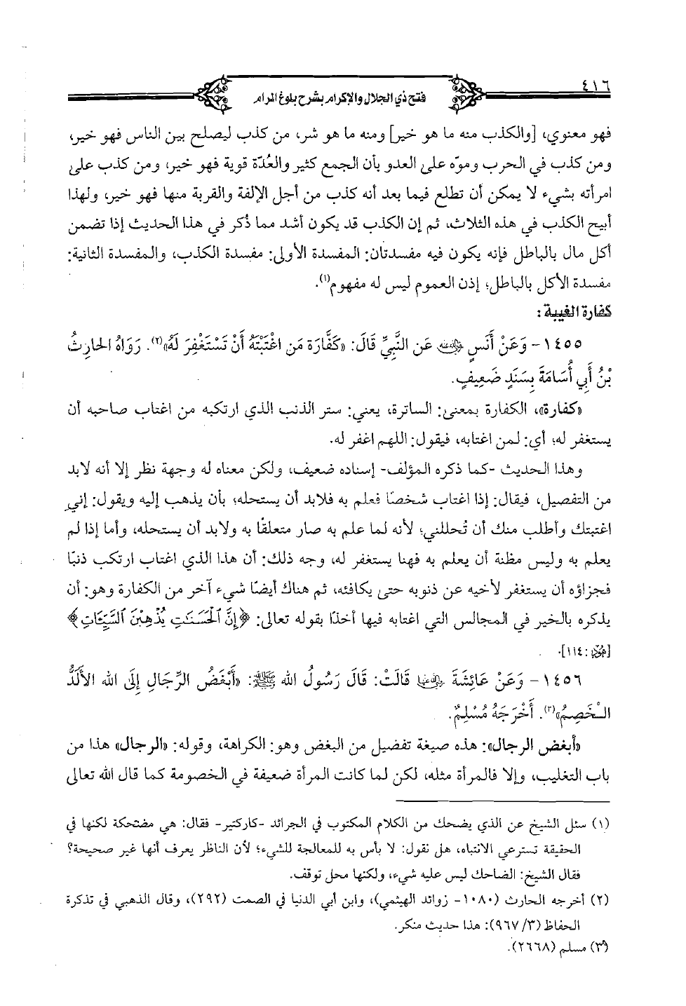 1455 - وعن أنس رضي الله عنه عن النبي صلى الله عليه وسلم: «كفارة من اغتبته أن تستغفر له» رواه الحارث بن أبي أسامة بسندٍ ضعيف.