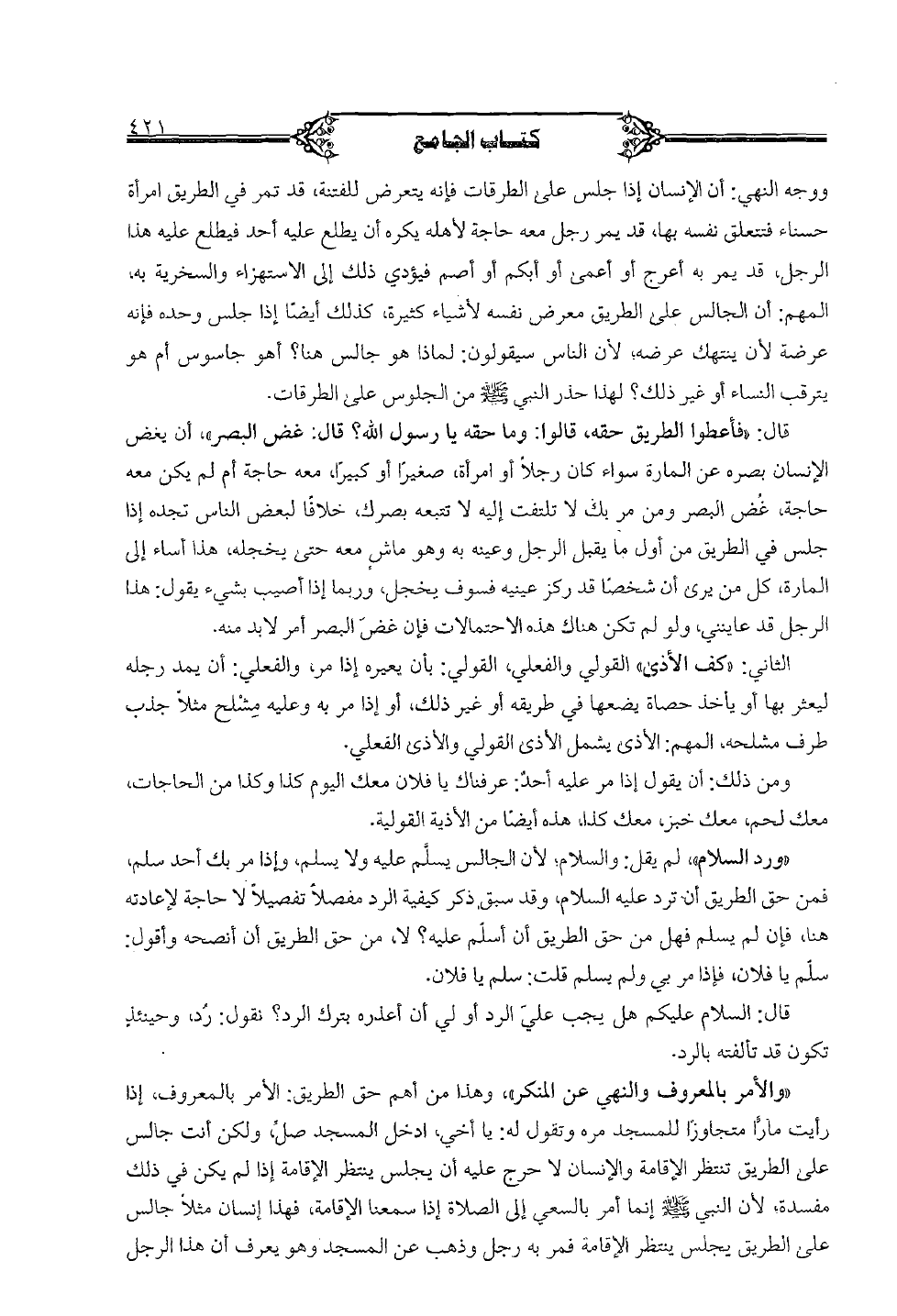 "والأمر بالمعروف والنهي عن المنكر"، وهذا من أهم حق الطريق: الأمر بالمعروف، إذا رأيت ماراً متجاوزاً للمسجد مره وتقول له: يا أخي، أدخل المسجد صل، ولكن أنت جالس على الطريق تنتظر الإقامة والإنسان لا حرج عليه أن يجلس ينتظر الإقامة إذا لم يكن في ذلك مفسدة؛ لأن النبي صلى الله عليه وسلم إنما أمر بالسعي إلي الصلاة إذا سمعنا الإقامة، فهذا إنسان مثلاً جالس على الطريق يجلى ينتظر الإقامة فمر به رجل وذهب عن المسجد وهو يعرف أن هذا الرجل