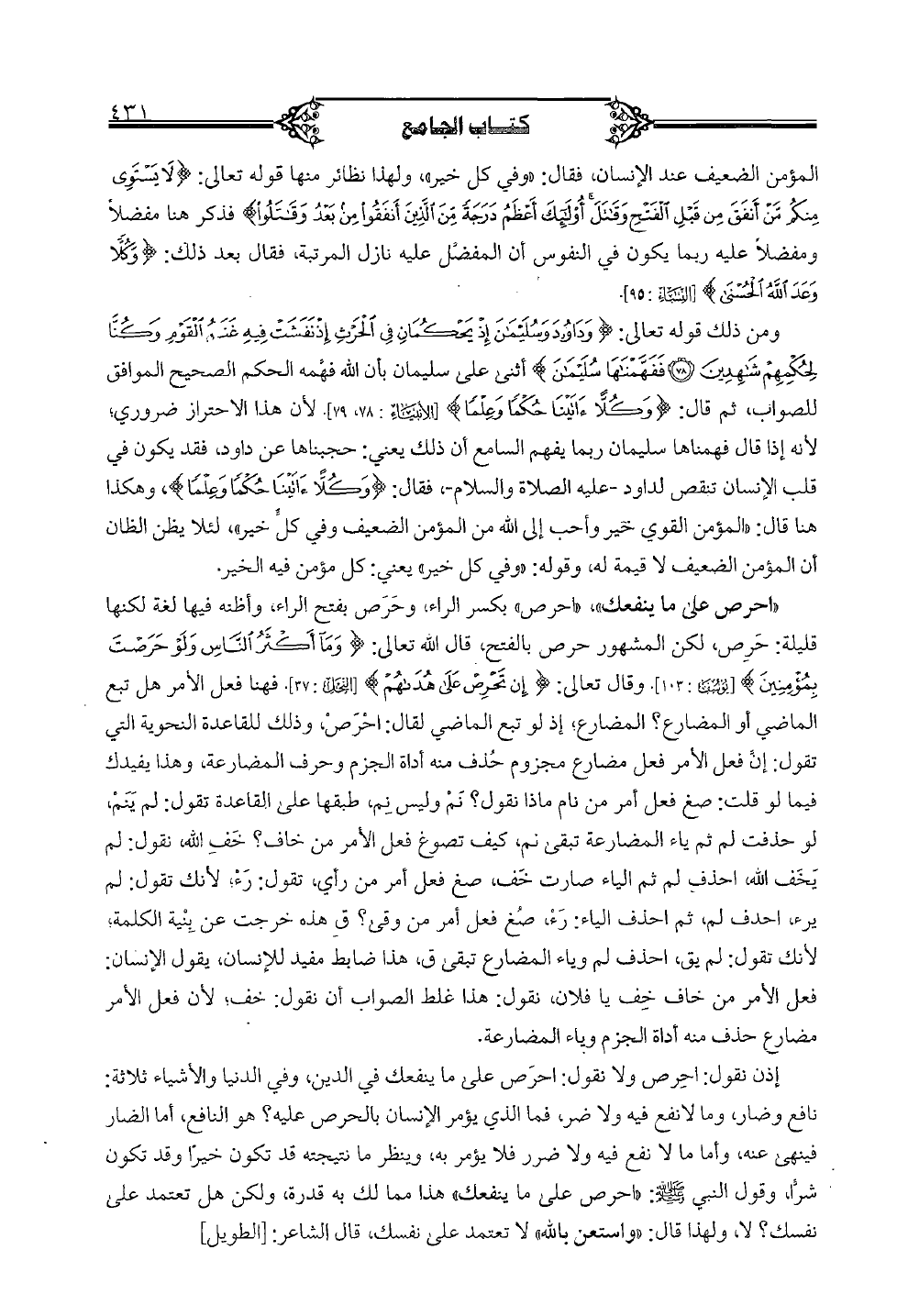 ومن ذلك قوله تعالى: {وداود وسليمن إذ يحكمان في الحرث إذ نفشت فيه غني القوم وكنا لحكمهم شهدين (78) ففهمنها سليمن} أثني على سليمان بأن الله فهمه الحكم الصحيح الموافق للصواب، ثم قال: {وكلا ءايتنا حكماً وعلماً} [الأنبياء: 78، 79]. لأن هذا الاحتراز ضروري، لأنه إذا قال فهمناها سليمان وبما يفهم السامع أن ذلك يعني: حجبناها عن داود، فقد يكون في قلب الإنسان تنقص لداود - عليه الصلاة والسلام، فقال: "المؤمن القوي خير وأحب إلي الله من المؤمن الضعيف وفي كل خير"، لئلا يظن الظان أن المؤمن الضعيف لا قيمة له، وقوله: "وفي كل خير" يعني: كل مؤمن فيه الخير.