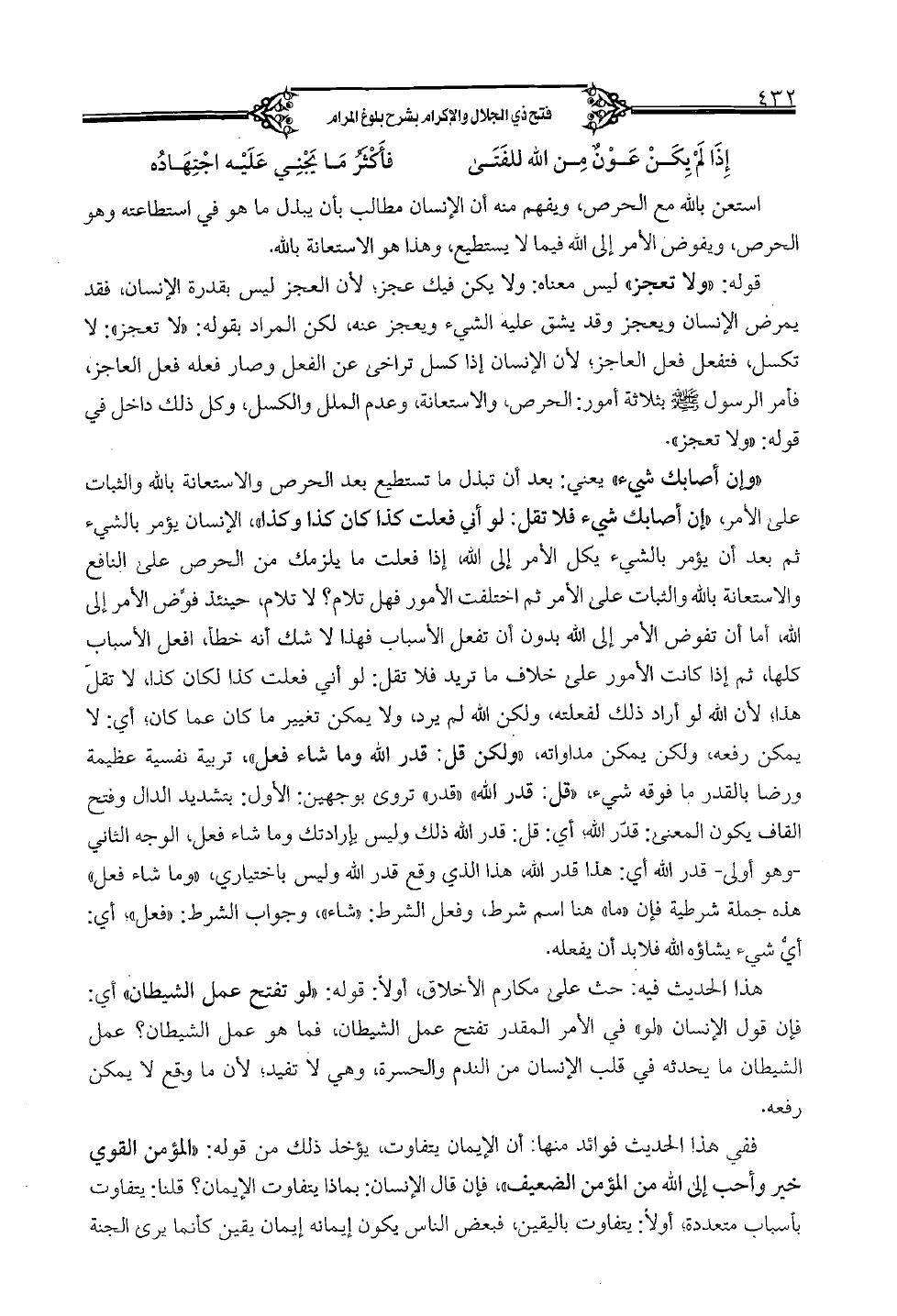 وإن أصابك شيء" يعني: بعد أن تبذل ما تستطع بعد الحرص والاستعانة بالله والثبات على الأمر، "إن أصابك شيء فلا تقل: لو أني فعلت كذا كان كذا وكذا"، الإنسان يؤمر بالشيء ثم بعد أن يؤمر بالشيء يكل الأمر إلى الله، إذا فعلت ما يلزمك من الحرص على الناقع والاستعانة بالله والثبات على الأمر ثم اختلفت الأمور فهل تلام، لا تلام، حينئذ فوض الأمر إلى الله، أما أن تفرض الأمر إلى الله بدون أن تفعل الأسباب فهذا لا شك أنه خطأ، افعل الأسباب كلها، ثم إذا كانت الأمور على خلاف ما تريد فلا تقل: لو أني فعلت كذا لكان كذا، لا تقل هذا؛ لأن الله لو أراد ذلك لفعلته، ولكن الله لم يرد، ولا يمكن تغيير ما كان عما كان؛ أي: لا يمكن رفعه، ولكن يمكن مداواته، "ولكن: قل: قدر الله وما شاء فعل"، تربية نفسية عظيمة ورضا بالقدر ما فوقه شيء، "قل: قدر الله" "قدر" تروى بوجهين: الأول: بتشديد الدال وفتح القاف يكون المعنى: قدر الله؛ أي: قل: قدر الله ذلك وليس بإرادتك وما شاء فعل، الوجه الثاني - وهو أولى - قدر الله أي: هذا قدر الله، هذا الذي وقع قدر الله وليس باختياري، "وما شاء فعل" هذه جملة شرطية فإن "ما" هنا اسم شرط، وفعل الشرط: "شاء"، وجواب الشرط: "فعل"؛ أي: أي شيء يشاؤه الله فلابد أن يفعله.