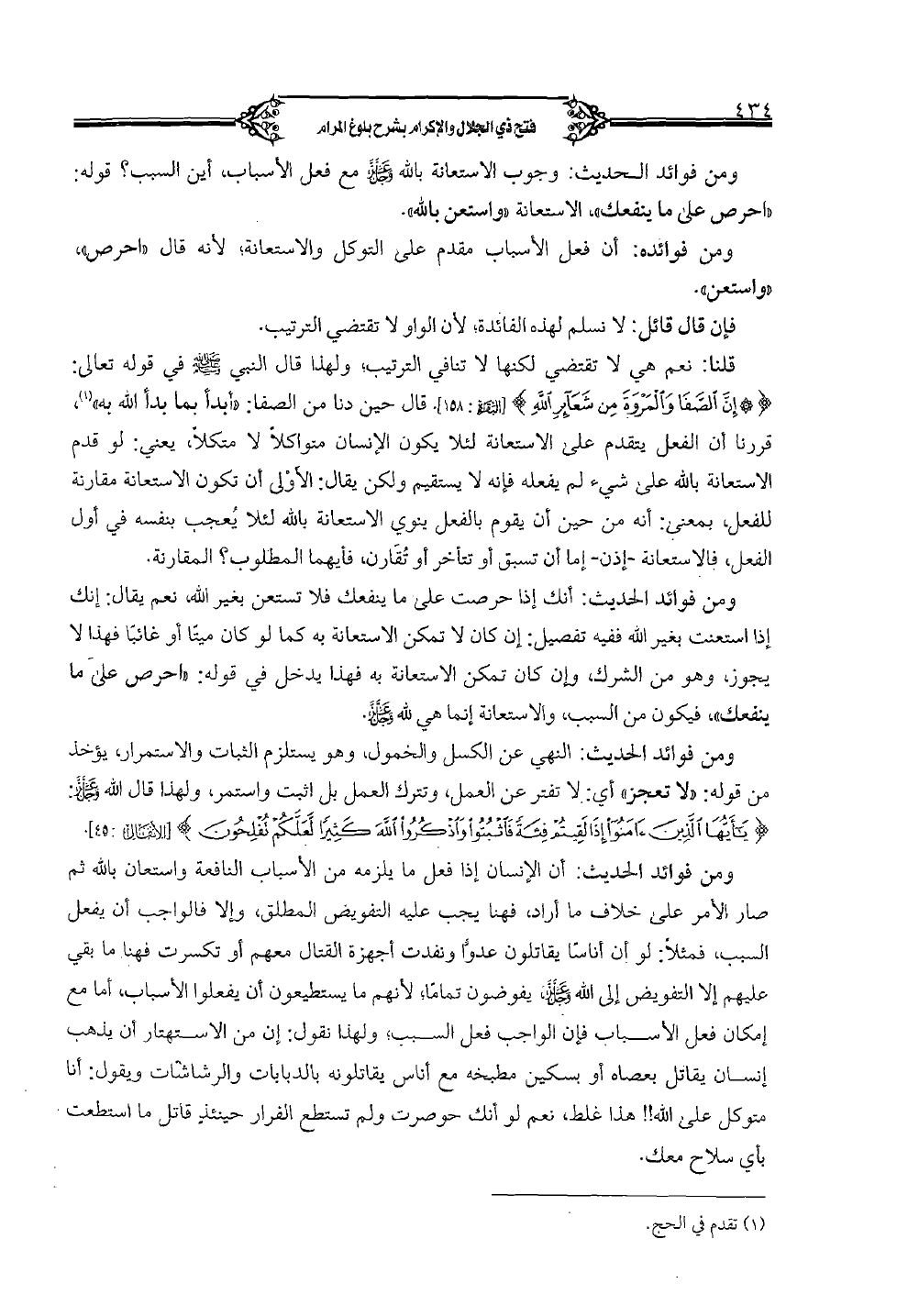 قلنا: نعم هي لا تقتفي لكنها لا تنافي الترتيب؛ ولهذا قال النبي صلى الله عليه وسلم فى قوله تعالى: {إن الصفا والمروة من شعائر الله} [البقرة: 158]. قال حين دنا من الصفا: "أبدأ بما بدأ الله به"، قررنا أن الفعل يتقدم على الاستعانة لئلا يكون الإنسان متواكلاً لا متكلاً، يعني: لو قدم الاستعانة بالله على شيء لم يفعله فإنه لا يستقيم ولكن يقال: الأولى أن تكون الاستعانة مقارنة للفعل، بمعنى: أنه من حين أن يقوم بالفعل ينوي الاستعانة بالله لئلا يعجب بنفسه في أول الفعل، فالاستعانة - إذن - إما أن تسبق أو تتأخر أو تقارن، فأيهما المطلوب؟ المقارنة.