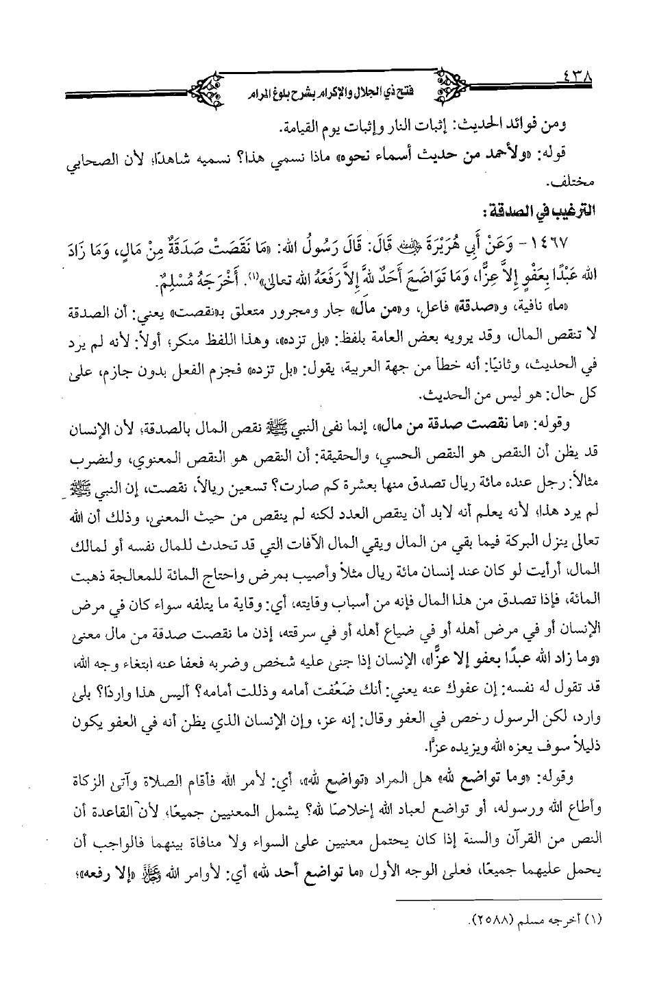 وقوله: "ما نقصت صدقة من مال", إنما نفى النبي صلى الله عليه وسلم نقص المال بالصدقة؛ لأن الإنسان قد يظن أن النقص هو النقص الحسي, والحقيقة: أن النقص المعنوي, ولنضرب مثالاً: رجل عنده مائة ريال تصدق منها بعشرة كم صارت؟ تعين ريالاً, نقصت, إن النبي صلى الله عليه وسلم لم يرد هذا؛ لأنه يعلم أنه لابد أن ينقص العدد لكنه لم ينقص من حيث المعنى, وذلك أن الله تعالى ينزل البركة فيما بقي من المال وبقي المال الآفات التي قد تحدث للمال نفسه أو لمالك المال, أرأيت لو كان عند إنسان مائة ريال مثلاً وأصيب بمرض واحتاج المائة للمعالجة ذهبت المائة, فإذا تصدق من هذا المال فإنه من أسباب وقايته, أي: وقاية ما يتلفه سواء كان في مرض الإنسان أو في مرض أهله أو في ضياع أهله أو في سرقته, إذن ما نقصت صدقة من مال معنى «وما زاد الله عبداً بعفو إلا عزا» الإنسان إذا جنى عليه شخص وضربه فعفا عنه ابتغاء وجه الله, قد تقول له نفسه: إن عفوك عنه يعني: أنك ضعفت أمامه وذللت أمامه؟ أليس هذا وارداً؟ بلى وارد, لكن الرسول رخص في العفو وقال: إنه عز, وإن الإنسان الذي يظن أنه في العفو يكون ذليلاً سوف يعزه الله ويزيده عزا.