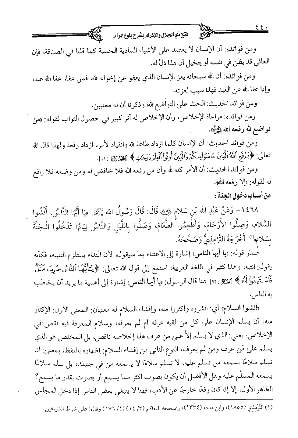 1468 - وعن عبد الله بن سلام رضي الله عنه قال: قال رسول الله صلى الله عليه وسلم: «يا أيها الناس, أفشوا السلام, وصلوا الأرحام, وأطعموا الطعام, وصلوا بالليل والناس نيام, تدخلوا الجنة بسلام» أخرجه الترمذي وصححه.