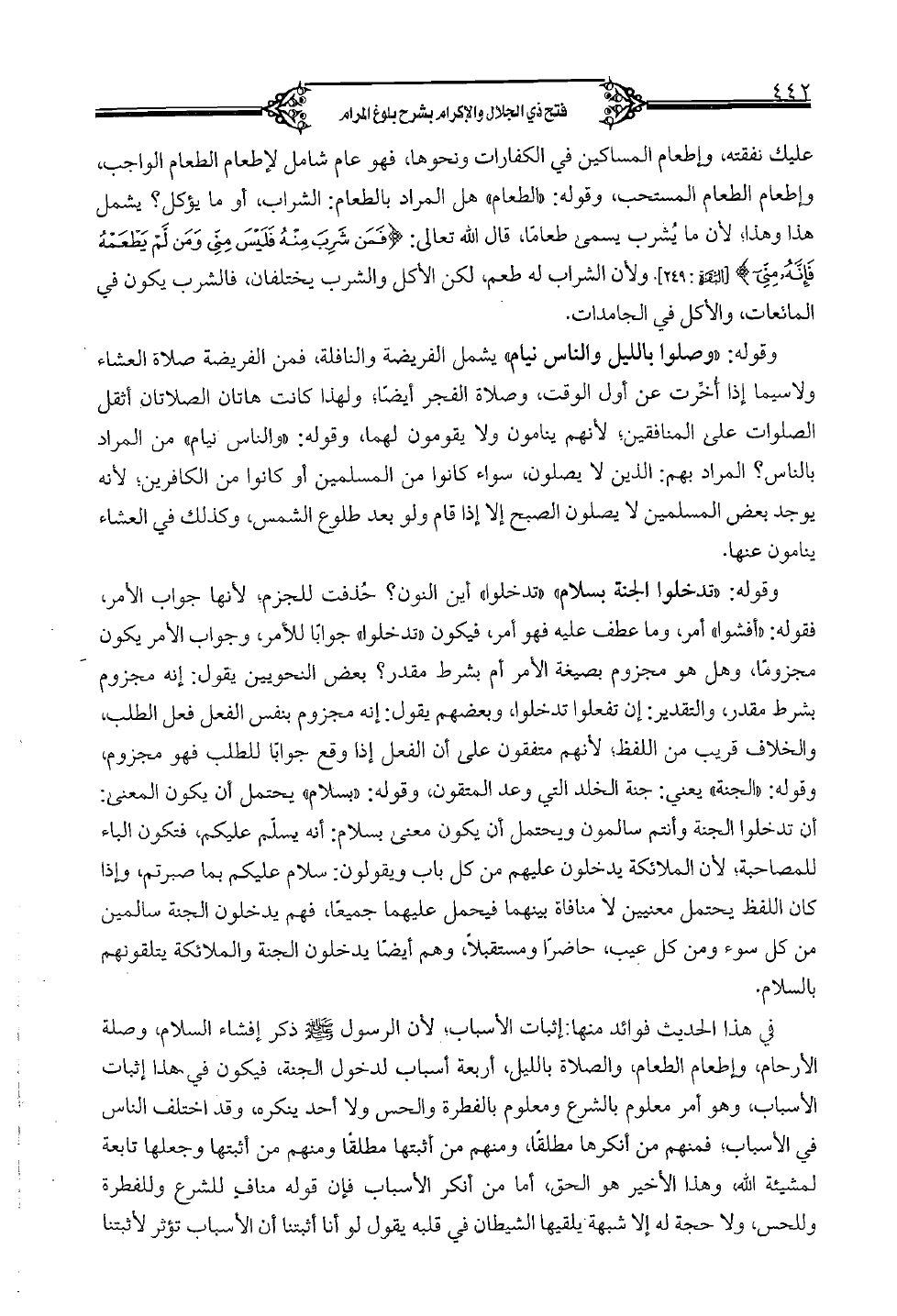وقوله: «تدخلوا الجنة بسلام» «تدخلوا» أين النون؟ حذفت للجزم لأنها جواب الأمر, فقوله: "أفشوا" أمر, وما عطف عليه فهو أمر, فيكون "تدخلوا" جواباً للأمر, وجواب الأمر يكون مجزوماً, وهل هو مجزوم بصيغة الأمر أم بشرط مقدر؟ بعض النحويين يقول: إنه مجزوم بشرط مقدر, والتقدير: إن تفعلوا تدخلوا, وبعضهم يقول: إنه مجزوم بنفس الفعل فعل الطلب, والخلاف قريب من اللفظ؛ لأنهم متفقون على أن الفعل إذا وقع جواباً للطلب فهو مجزوم, وقوله: "الجنة" يعني: جنة الخلد التي وعد المتقون, وقوله: "بسلام" يحتمل أن يكون المعنى: أن تدخلوا الجنة أنتم سالمون ويحتمل أن يكون معنى بسلام: أنه يسلم عليكم, فتكون الباء للمصاحبة؛ لأن الملائكة يدخلون عليهم من كل باب ويقولون: سلام عليكم بما صبرتم, وإذا كان اللفظ يحتمل معنيين لا منافاة بينهما فيحمل عليهما جميعاً, فهم يدخلون الجنة سالمين من كل سوء ومن كل عيب, حاضراً ومستقبلاً, وهم أيضاً يدخلون الجنة الملائكة يتلقونهم بالسلام.