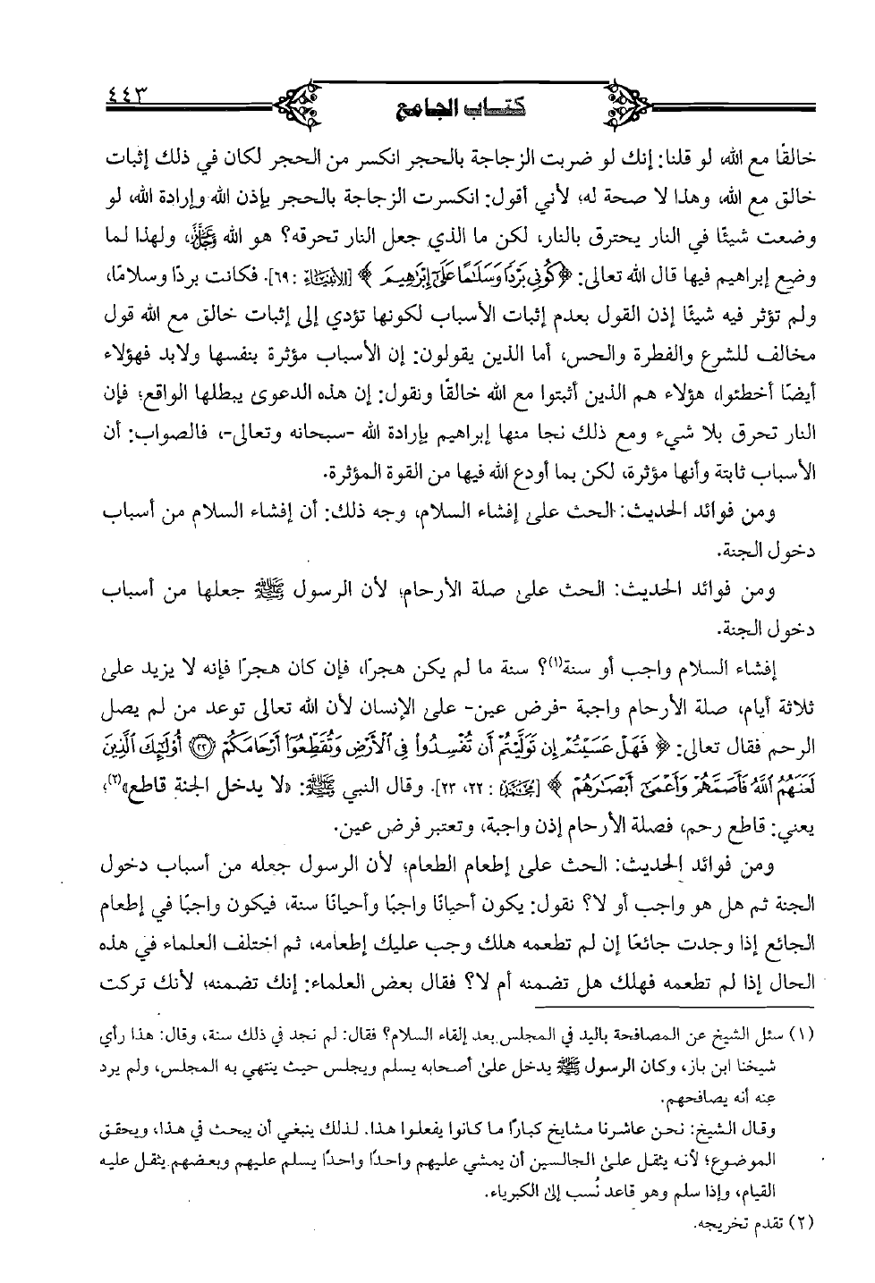 إفشاء السلام واجب أو سنة؟ سنة ما لم يكن هجراً, فإن كان هجراً فإنه لا يزيد على ثلاثة أيام, صلة الأرحام واجبة -فرض عين- على الإنسان لأن الله تعالى توعد من لم يصل الرحم فقال تعالى: {فهل عسيتم إن توليتم أن تفسدوا في الأرض وتقطعوا أرحامكم (22) أولئك الذين لعنهم الله فأصمهم وأعمى أبصارهم} [محمد 22 - 23]. وقال النبي صلى الله عليه وسلم: «لا يدخل الجنة قاطع»؛ يعني: قاطع رحم, فصلة الأرحام إذن واجبة, وتعتبر فرض عين.