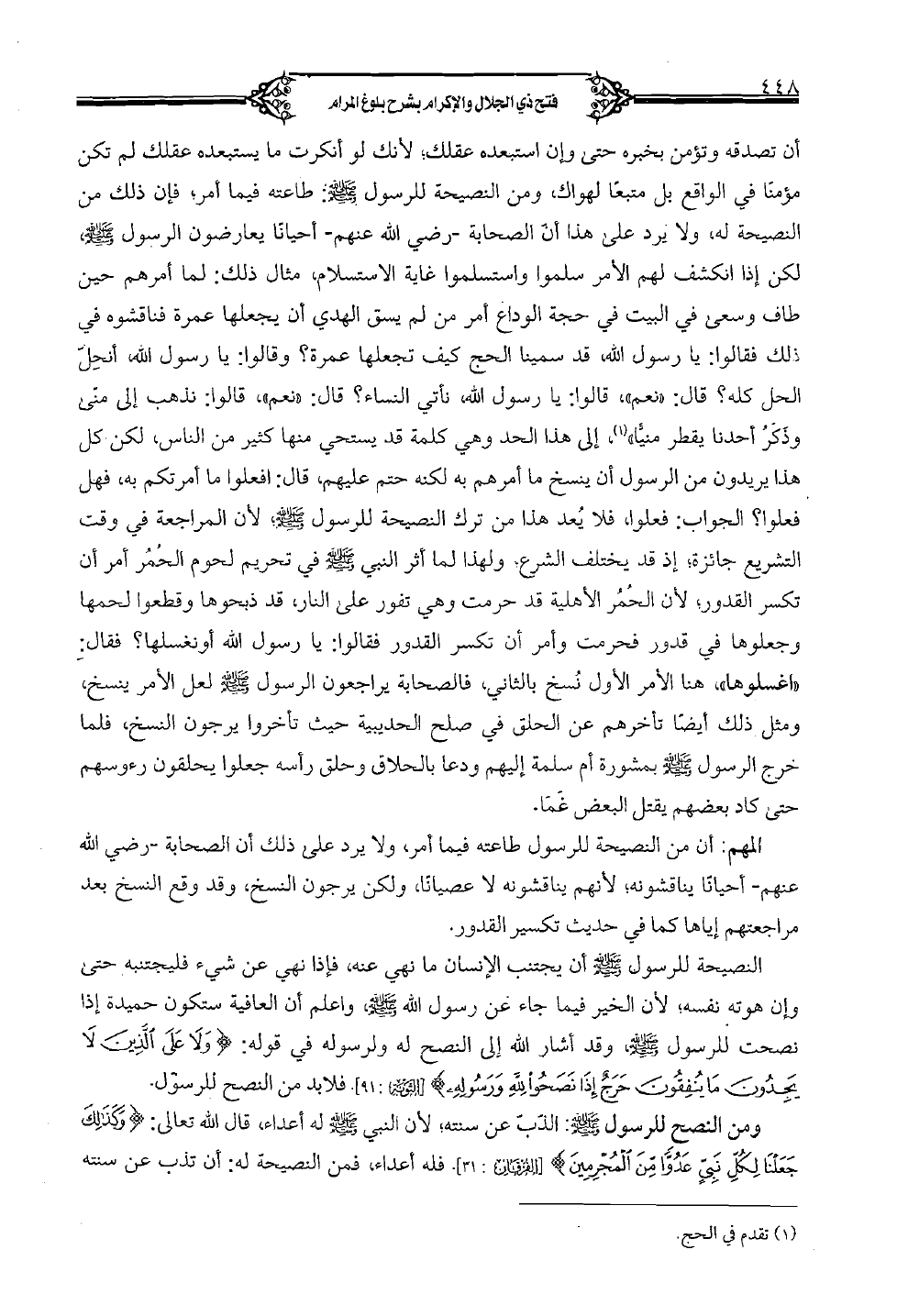 أن تصدقه وتؤمن بخبره حتى وإن استبعده عقلك؛ لأنك لو أنكرت ما يستبعده عقلك لم تكن مؤمناً في الواقع بل متبعاً لهواك, ومن النصيحة للرسول صلى الله عليه وسلم: طاعته فيما أمر؛ فإن ذلك من النصيحة له, ولا يرد على هذا أن الصحابة -رضي الله عنهم- أحياناً يعارضون الرسول صلى الله عليه وسلم لكن إذا انكشف لهم الأمر سلموا واستسلموا غاية الاستسلام, مثال ذلك: لما أمرهم حين طاف وسعى في البيت في حجة الوداع أمر من لم يسق الهدي أن يجعلها عمرة فناقشوه في ذلك فقالوا: يا رسول الله قد سمينا الحج كيف تجعلها عمرة؟ وقالوا: يا رسول الله, أنحل الحل كله؟ قال: "نعم", قالوا: يا رسول الله نأتي النساء؟ قال: "نعم", قالوا: نذهب إلى منى وذكر أحدنا يقطر منياً", إلى هذا الحد وهي كلمة قد يستحي منها كثير من الناس, لكن كل هذا يريدون من الرسول أن ينسخ ما أمرهم به لكنه حتم عليهم, قال: افعلوا ما أمرتكم به, فهل فعلوا؟ الجواب: فعلوا, فلا يعد هذا من ترك النصيحة للرسول صلى الله عليه وسلم؛ لأن المراجعة في وقت التشريع جائزة, إذ قد يختلف الشرع, ولهذا لما أثر النبي صلى الله عليه وسلم في تحريم لحوم الحمر أمر أن تكسر القدور, لأن الحمر الأهلية قد حرمت وهي تفور على النار, قد ذبحوها وقطعوا لحمها وجعلوها في قدور فحرمت وأمر أن تكسر القدور فقالوا: يا رسول الله أونغسلها؟ فقال: "أغسلوها" هنا الأمر نسخ بالثاني, فالصحابة يراجعون الرسول صلى الله عليه وسلم لعل الأمر ينسخ, ومثل ذلك أيضًا تأخرهم عن الحلق في صلح الحديبية حيث تأخروا يرجون النسخ, فلما خرج الرسول صلى الله عليه وسلم بمشورة أم سلمة إليهم دعا بالحلاق وحلق رأسه جعلوا يحلقون رءوسهم حتى كاد بعضهم يقتل البعض غما.