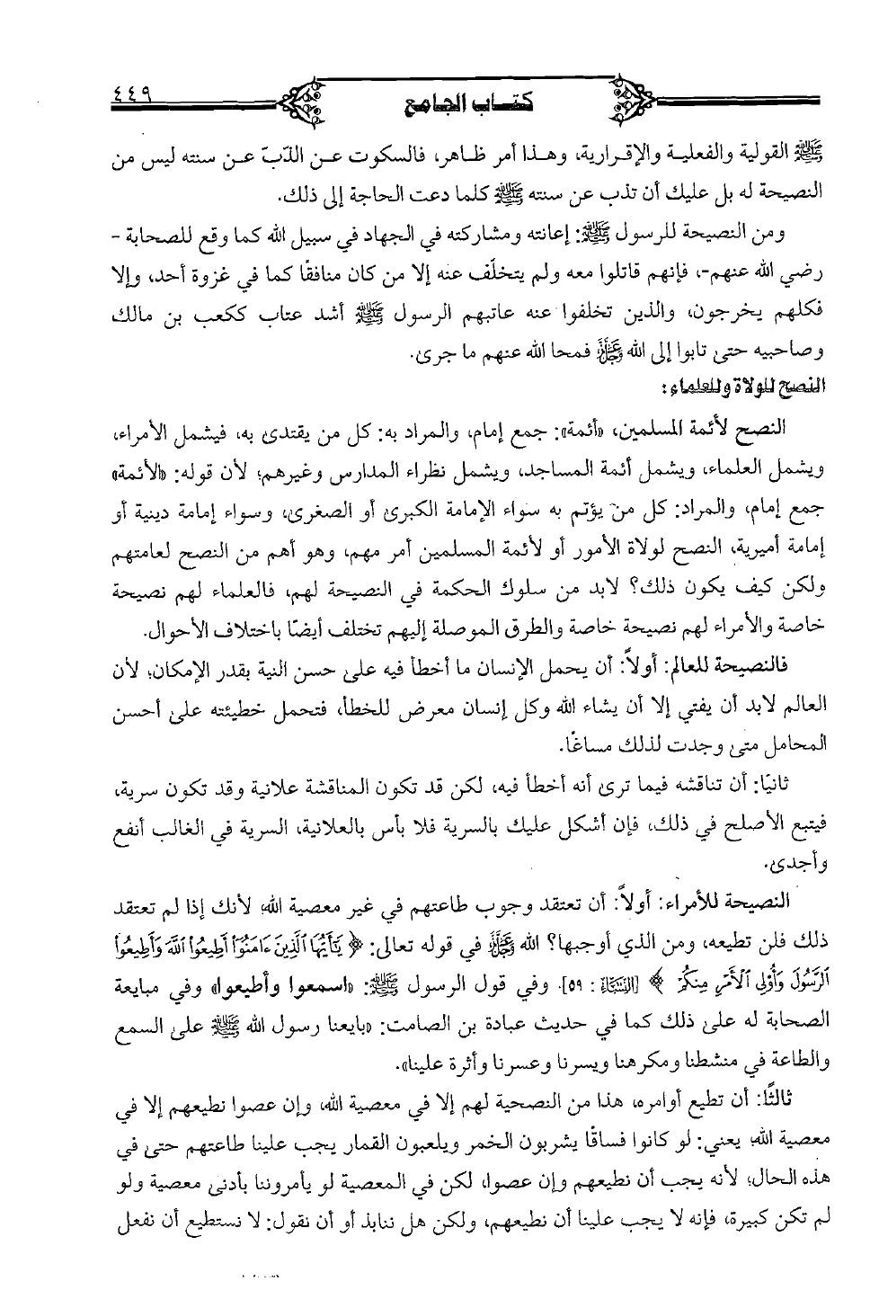 النصح لأئمة المسلمين, "أئمة": جمع إمام والمراد به: كل من يقتدي به, فيشمل الأمراء, ويشمل العلماء, ويشمل أئمة المساجد, ويشمل نظراء المدارس وغيرهم؛ لأن قوله: "الأئمة" جمع إمام, المراد: كل من يؤتم به سواء الإمامة الكبرى أو الصغرى وسواء إمامة دينية أو إمامة أميرية, النصح لولاة الأمور أو لأئمة المسلمين أمر مهم, وهو أهم نم النصح لعامتهم ولكن كيف يكون ذلك؟ لابد من سلوك الحكمة في النصيحة لهم, فالعلماء لهم نصيحة خاصة والأمراء لهم نصيحة خاصة والطرق الموصلة إليهم تختلف أيضاً باختلاف الأحوال.