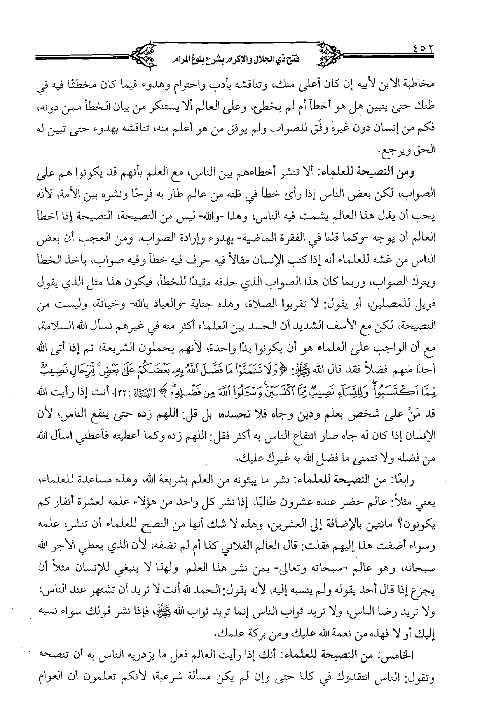 ومن النصيحة للعلماء: ألا تنشر أخطاءهم بين الناس، مع العلم بأنهم قد يكونوا هم على الصواب، لكن بعض الناس إذا رأى خطأ في ظنه من عالم طار به فرحاً ونشره بين الأمة؛ لأنه يحب أن يذل هذا العالم يشمت فيه الناس، وهذا -والله- من النصيحة، النصيحة إذا أخطأ العالم أن يوجه -وكما قلنا في الفقرة الماضية- بهدوء وإرادة الصواب، ومن العجب أن بعض الناس من غشه للعلماء أنه إذا كتب الإنسان مقالاً فيه حرف فيه خطأ وفيه صواب، يأخذ الخطأ ويترك الصواب، وربما كان هذا الصواب الذي حذفه مقيداً للخطأ، فيكون هذا مثل الذي يقول فويل للمصلين، أو يقول: لا تقربوا الصلاة، وهذه جناية -والعياذ بالله- وخيانة، وليست من النصيحة، لكن مع الأسف الشديد أن الحسد بين العلماء أكثر منه في غيرهم نسأل الله السلامة، مع أن الواجب على العلماء هو أن يكونوا يداً واحدة؛ لأنهم يحملون الشريعة، ثم إذا أتى الله أحداً منهم فضلاً فقد قال الله عز وجل: {ولا تتمنوا ما فضل الله به بعضكم على بعضٍ للرجال نصيب مما اكتسبوا وللنساء نصيب مما اكتسبن وسئلوا الله من فضله} [النساء: 32]. أنت إذا رأيت الله قد من على شخص بعلم ودين وجاه فلا تحسده، بل قل: اللهم زده حتى ينفع الناس؛ لأن الإنسان إذا كان له جاه صار انتفاع الناس به أكثر فقل: اللهم زده وكما أعطيته فأعطني أسأل الله من فضله ولا تتمنى ما فضل الله به غيرك عليك.