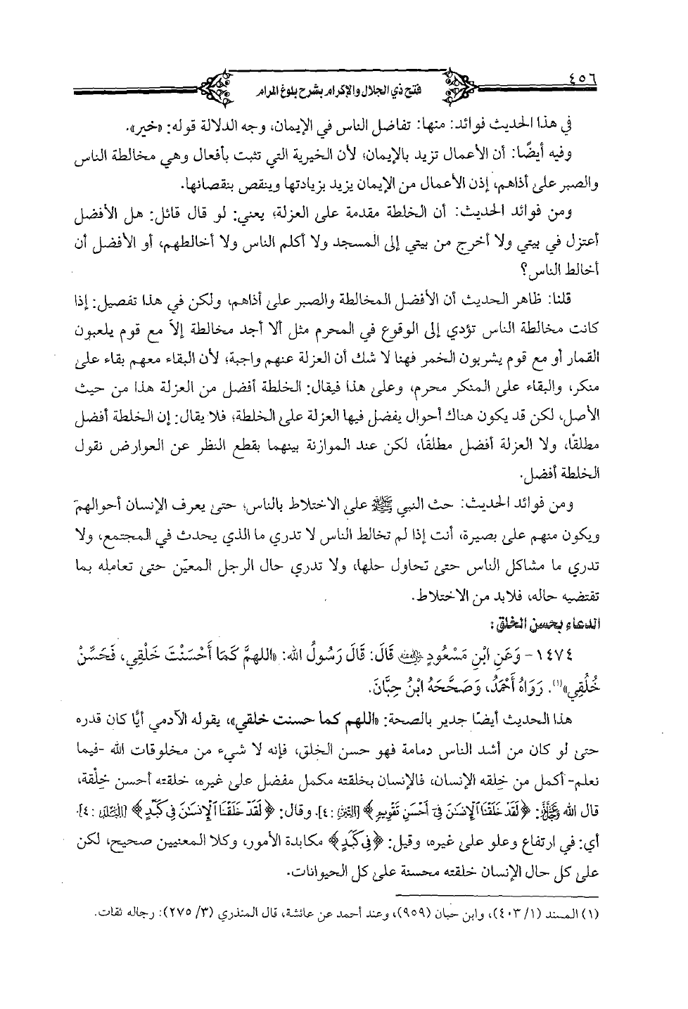 1474 - وعن ابن مسعودٍ رضي الله عنه قال: قال رسول الله: «اللهم كما أحسنت خَلقي، فحسن خُلقي». رواه أحمد، وصححه ابن حبان.