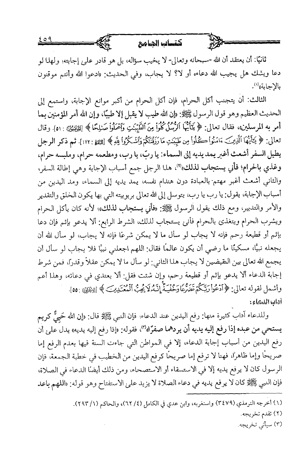 الثالث: أن يتجنب أكل الحرام، فإن أكل الحرام من أكبر موانع الإجابة، واستمع إلى الحديث العظيم وهو قول الرسول صلى الله عليه وسلم: "إن الله طيب لا يقبل إلا طيباً، وإن الله أمر المؤمنين بما أمر به المرسلين"، فقال تعالى: {يأيها الرسل كلوا من الطيبات واعملوا صالحاً} [المؤمنون: 51]. وقال تعالى: {يأيها الذين ءامنوا كلوا من طيبات ما رزقناكم واشكروا لله} [البقرة: 172]. ثم ذكر الرجل يطيل السفر أشعث أغبر يمد يديه إلى السماء: يا رب، يا رب، ومطمعه حرام، وملبسه حرام، وغذي بالحرام؛ فأني يستجاب لذلك"، هذا الرجل جمع أسباب الإجابة وهي إطالة السفر، والثاني أشعث أغبر مهتم بالعبادة دون هندام نفسه، يمد يديه إلى السماء، ومد اليدين من أسباب الإجابة، يقول: يا رب يا رب، يتوسل إلى الله تعالى بربوبيته التي بها يكون الخلق والتقدير والأمر والتدبير، ومع ذلك يقول الرسول صلى الله عليه وسلم: "فأني يستجاب لذلك"؛ لأنه كان يأكل الحرام ويشرب الحرام ويتغذى بالحرام فأنى يستجاب لذلك، الشرط الرابع: ألا يدعو بإثم فإن دعا بإثم أو قطيعة رحم فإنه لا يجاب لو سأل ما لا يمكن شرعاً فإنه لا يجاب، لو سأل الله أن يجعله نبياً، مسكيناٌ ما رضي أن يكون عالماً فقال: اللهم اجعلني نبياً فلا يجاب لو سأل أن يجمع الله تعالى بين النقيضين لا يجاب هذا الثاني: لو سأل ما لا يمكن عقلاً وقدراً، فمن شرط إجابة الدعاء ألا يدعو بإثم أو قطيعة رحم، وإن شئت فقل: ألا يعتدي في دعائه، وهذا أعم وأشمل لقوله تعالى: {ادعوا ربكم تضرعاً وخفيةً إنه لا يحب المعتدين} [الأعراف: 55].