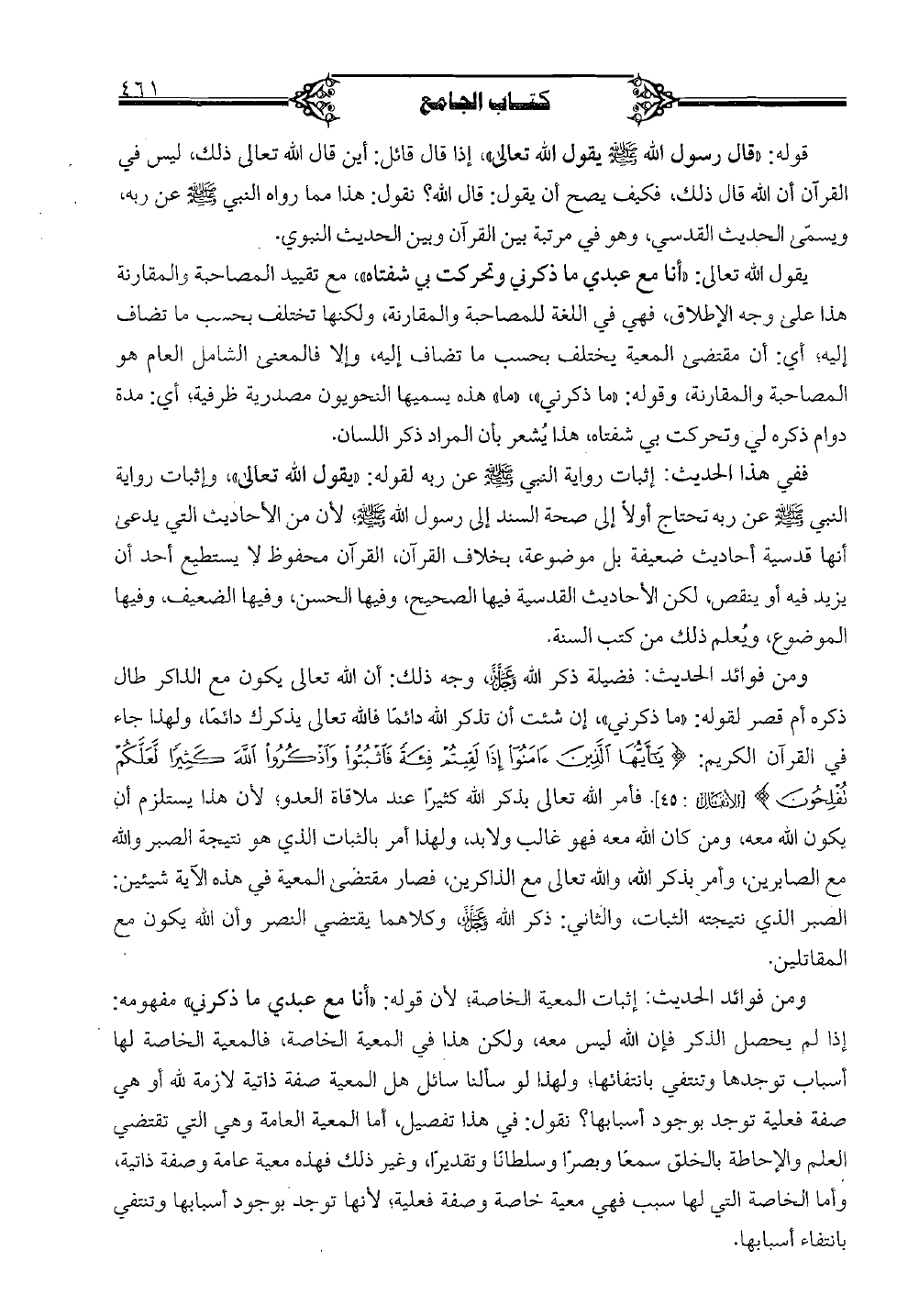 يقول الله تعالى: "أنا مع عبدي ما ذكرني وتحركت بي شفتاه"، مع تقييد المصاحبة والمقارنة هذا على وجه الإطلاق، فهي في اللغة للمصاحبة والمقارنة، ولكنها تختلف بحسب ما تضاف إليه؛ أي: أن مقتضى المعية يختلف بحسب ما تضاف إليه، وإلا فالمعنى الشامل العام هو المصاحبة والمقارنة، وقوله: "ما ذكرني"، "ما" هذه يسميها النحويون مصدرية ظرفية؛ أي: مدة دوام ذكره لي وتحركت بي شفتاه، هذا يشعر بأن المراد ذكر اللسان.