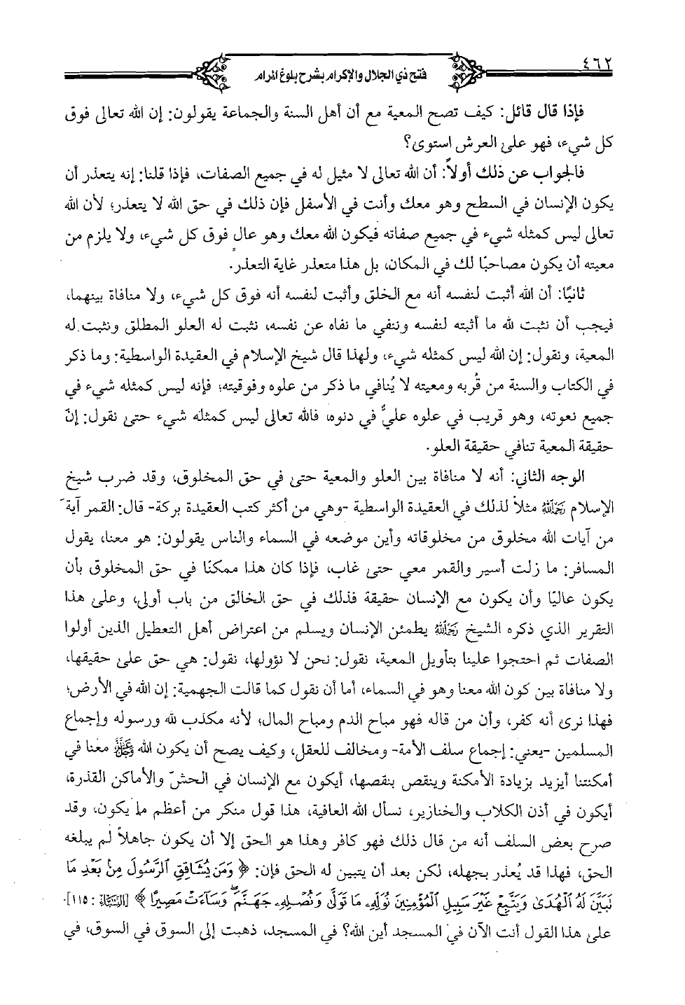الوجه الثاني: أنه لا منافاة بين العلو والمعية حتى في حق المخلوق، وقد ضرب شيخ الإسلام رحمه الله مثلاً لذلك في العقيدة الواسطية -وهي من أكثر كتب العقيدة بركة- قال: القمر آية من آيات الله مخلوق من مخلوقاته وأين موضعه في السماء والناس يقولون: هو معنا، يقول المسافر: ما زلت أسير والقمر معي حتى غاب، فإذا كان هذا ممكناً في حق المخلوق بأن يكون عالياً وأن يكون مع الإنسان حقيقة فذلك في حق الخالق من باب أولى، وعلى هذا التقرير الذي ذكره الشيخ رحمه الله يطمئن الإنسان ويسلم من اعتراض أهل التعطيل الذين أولوا الصفات ثم احتجوا علينا بتأويل المعية، نقول: نحن لا نؤولها، نقول: هي حق على حقيقها، ولا منافاة بين كون الله معنا وهو في السماء، أما أن نقول كما قالت الجهمية: إن الله في الأرض؛ فهذا نرى أنه كفر، وأن من قاله فهو مباح الدم ومباح المال؛ لأنه مكذب لله ورسوله وإجماع المسلمين- يعني: إجماع سلف الأمة- ومخالف للعقل، وكيف يصح أن يكون الله عز وجل معنا في أمكنتنا أيزيد بزيادة الأمكنة وينقص بنقصها، أيكون مع الإنسان في الحش والأماكن القذرة، أيكون في أذن الكلاب والخنازير، نسأل الله العافية، هذا قول منكر من أعظم ما يكون، وقد صرح بعض السلف أنه من قال ذلك فهو كافر وهذا هو الحق إلا أن يكون جاهلاً لم يبلغه الحق، فهذا قد يعذر بجهله، لكن بعد أن يتبين له الحق فإن: {ومن يشاقق الرسول من بعد ما تبين له الهدى ويتبع غير سبيل المؤمنين نوله ما تولى ونصله جهنم وسآءت مصيراً} [النساء: 115]. على هذا القول أنت الآن في المسجد أين الله؟ في المسجد، ذهبت إلى السوق في السوق، في