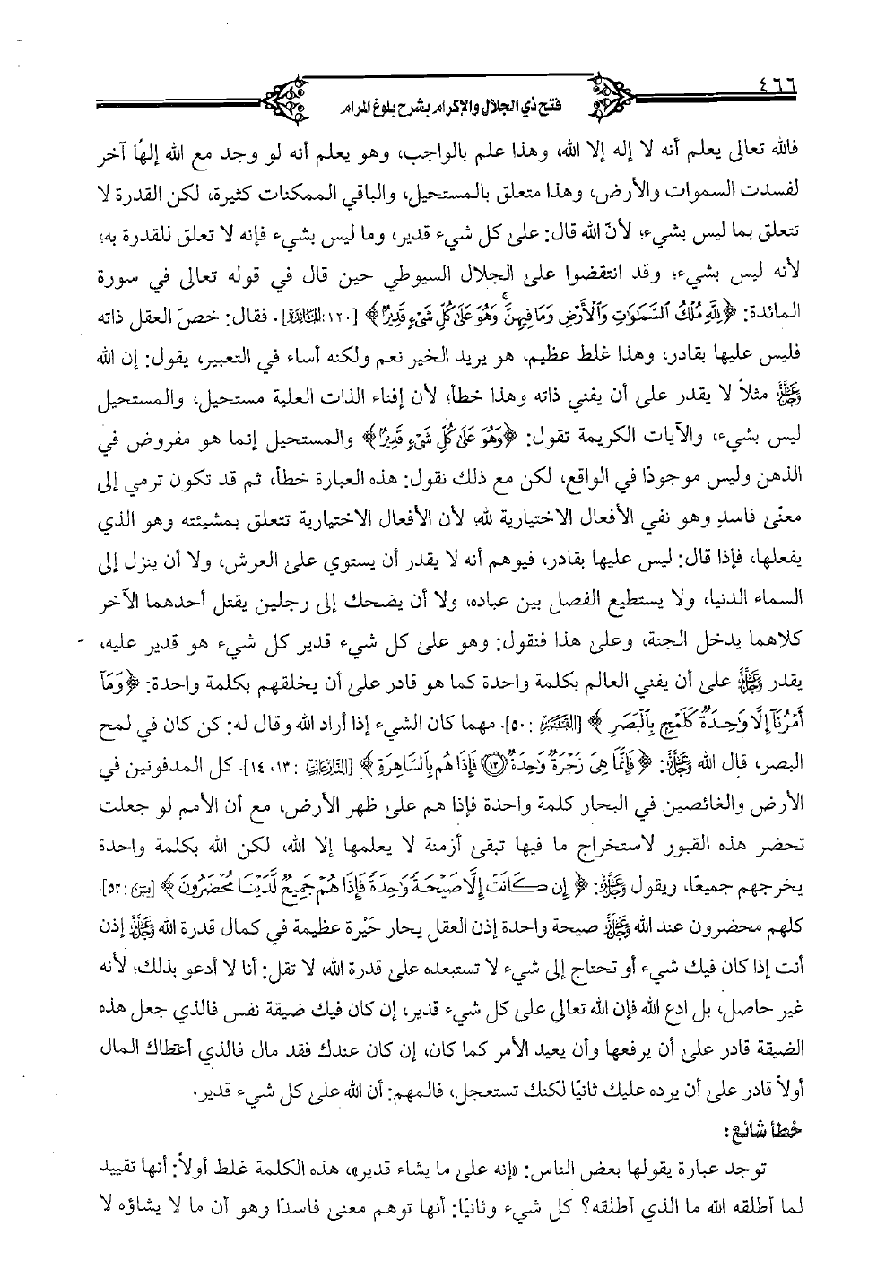 توجد عبارة يقولها بعض الناس: "إنه على ما يشاء قدير"، هذه الكلمة غلط أولاً: أنها تقييد لما أطلقه الله ما الذي أطلقه؟ كل شيء وثانياً: أنها توهم معنى فاسداً وهو أن ما لا يشاؤه لا