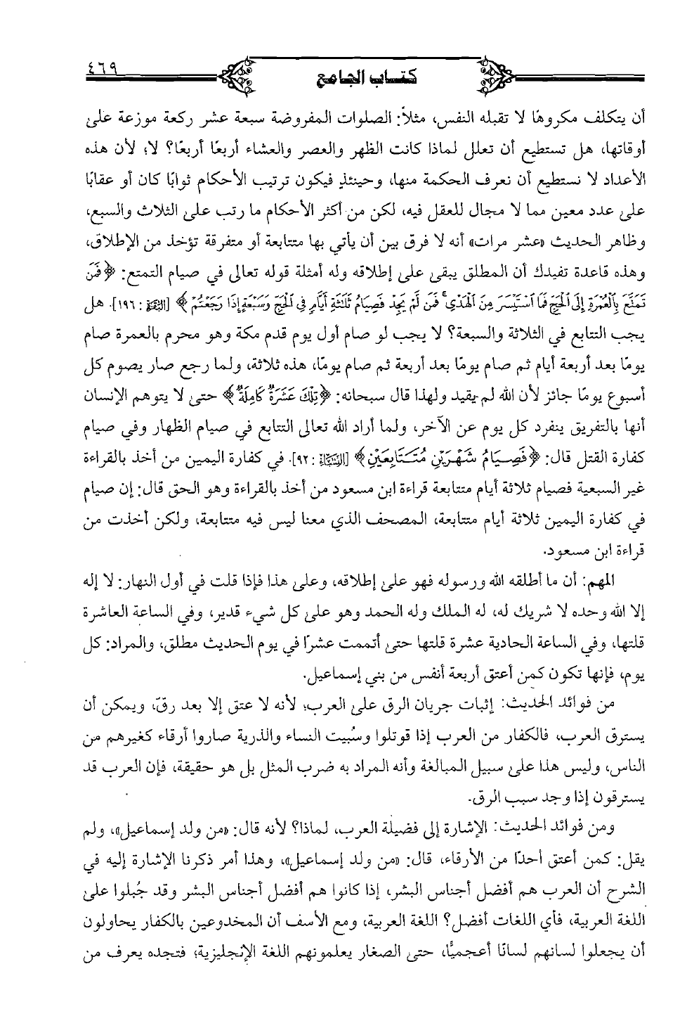 أن يتكلف مكروهاً لا تقبله النفس، مثلاً: الصلوات المفروضة سبعة عشر ركعة موزعة على أوقاتها، هل تستطيع أن تعلل لماذا كانت الظهر والعصر والعشاء أربعاً أربعاً؟ لا؛ لأن هذه الأعداد لا نستطيع أن نعرف الحكمة منها، وحينئذٍ فيكون ترتيب الأحكام ثواباً كان أو عقاباً على عدد معين مما لا مجال للعقل فيه، لكن من أكثر الأحكام ما رتب على الثلاث والسبع، وظاهر الحديث "عشر مرات" أنه لا فرق بين أن يأتي بها متتابعة أو متفرقة تؤخذ من الإطلاق، وهذه قاعدة تفيدك أن المطلق يبقى على إطلاقه وله أمثلة قوله تعالى في صيام التمتع: {فمن تمتع بالعمرة إلى الحج فما استيسر من الهدى فمن لم يجد فصيام ثلاثة أيامٍ في الحج وسبعة إذا رجعتم} [البقرة: 196]. هل يجب التتابع في الثلاثة والسبعة؟ لا يجب لو صام أول يوم قدم مكة وهو محرم بالعمرة صام يوماً، هذه ثلاثة، ولما رجع صار يصوم كل أسبوع يوماً جائز لأن الله لم يقيد ولهذا قال سبحانه: {تلك عشرة كاملة} حتى لا يتوهم الإنسان أنها بالتفريق ينفرد كل يوم عن الآخر، ولما أراد الله تعالى التتابع في صيام الظهار وفي صيام كفارة القتل قال: {فصيام شهرين متتابعين} [النساء: 92]. في كفارة اليمين من أخذ بالقراءة غير السبعية فصيام ثلاثة أيام متتابعة قراءة ابن مسعود من أخذ بالقراءة وهو الحق قال: إن صيام في كفارة اليمين ثلاثة أيام متتابعة، المصحف الذي معنا ليس فيه متتابعة، ولكن أخذت من قراءة ابن مسعود.