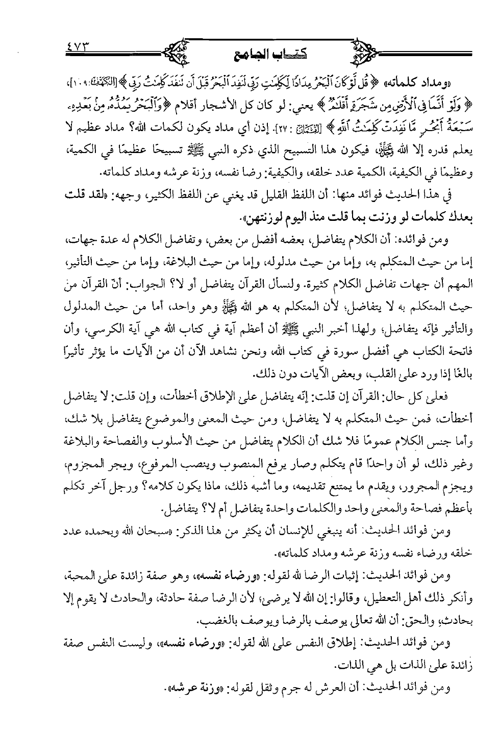 "ومداد كلماته" {قل لو كان البحر مداداً لكلمات ربي لنفد البحر قبل أن تنفد كلمات ربي} [الكهف: 109]، {ولو أنما في الأرض من شجرةٍ أقلام} يعني: لو كان كل الأشجار أقلام {والبحر يمده من بعده سبعة أبحر ما نفدت كلمات الله} [لقمان: 27]. إذن أي مداد يكون لكمات الله؟ مداد عظيم لا يعلم قدره إلا الله عز وجل، فيكون هذا التسبيح الذي ذكره النبي صلى الله عليه وسلم تسبيحاً عظيماً في الكمية، وعظيماً في الكيفية، الكمية عدد خلقه، والكيفية: رضا نفسه، وزنة عرشه ومداد كلماته.