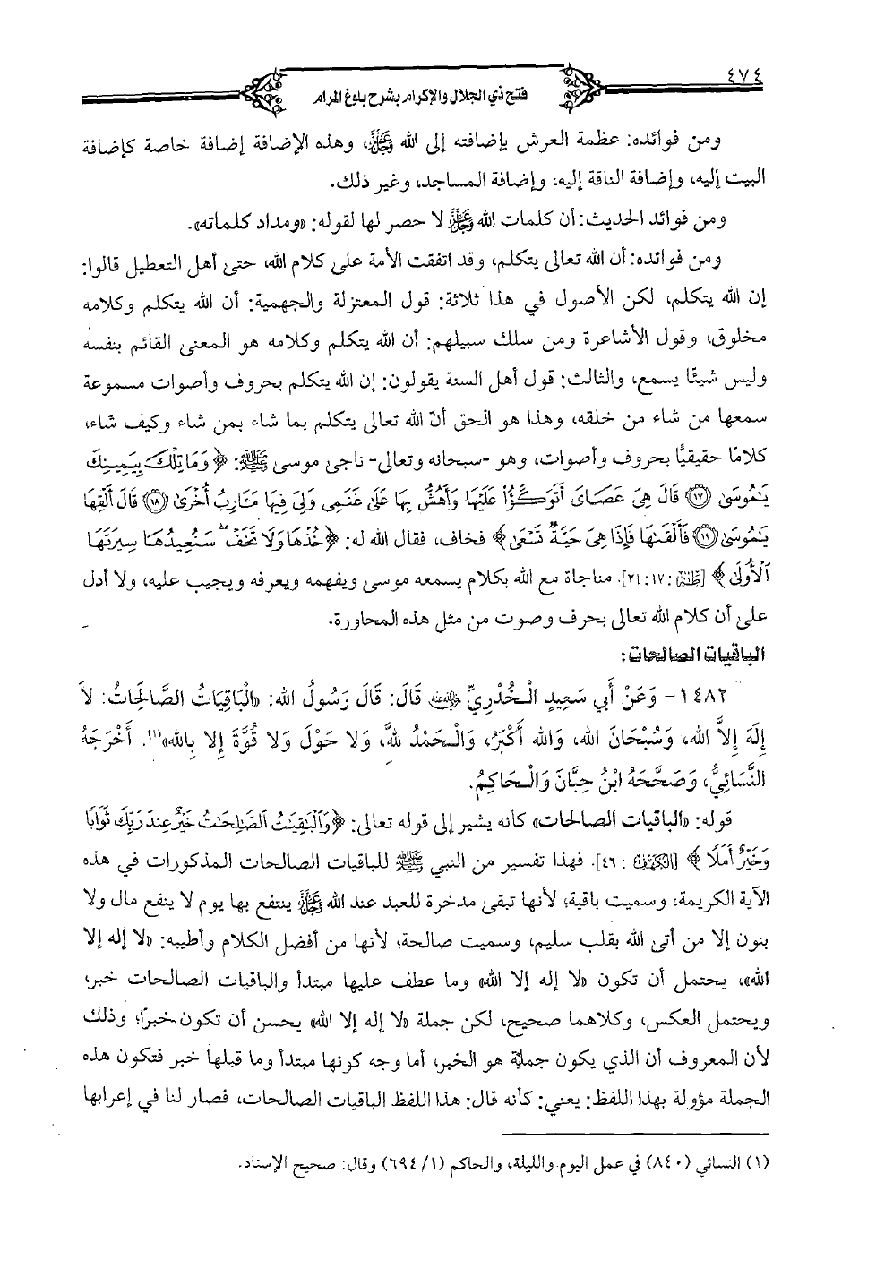 1482 - وعن أبي سعيدٍ الخدري رضي الله عنه قال: قال رسول الله: «الباقيات الصالحات: لا إله إلا الله، وسبحان الله، والله أكبر، والحمد لله، ولا حول ولا قوة إلا بالله». أخرجه النسائي، وصححه ابن حبان والحاكم.