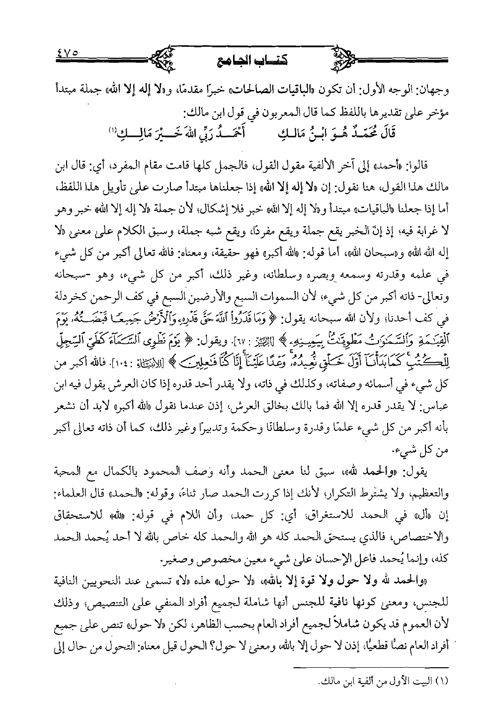 قالوا: "أحمد" إلى آخر الألفية مقول القول، فالجمل كلها قامت مقام المفرد؛ أي: قال ابن مالك هذا القول، هنا نقول: إن "لا إله إلا الله" إذا جعلناها مبتدأ صارت على تأويل هذا اللفظ، أما إذا جعلنا "الباقيات" مبتدأ و"لا إله إلا الله" خبر فلا إشكال؛ لأن جملة "لا إله إلا الله" خبر وهو لا غرابة فيه؛ إذ إن الخبر يقع جملة ويقع مفرداً، ويقع شبه جملة، وسبق الكلام على معنى "لا إله الله الله" و"سبحان الله"، أما قوله: "الله أكبر" فهو حقيقة، ومعناه: فالله تعالى أكبر من كل شيء في علمه وقدرته وسمعه وبصره وسلطانه، وغير ذلك، أكبر من كل شيء، وهو -سبحانه وتعالى- ذاته أكبر من كل شيء؛ لأن السموات السبع والأرضين السبع في كف الرحمن كخردلة في كف أحدنا؛ ولأن الله سبحانه يقول: {وما قدروا الله حق قدره والأرض جميعاً قبضته يوم القيامة والسموات مطويات بيمينه} [الرمز: 67]. ويقول: {يوم نطوي السماء كطي السجل للكتب كما بدأنا أول خلقٍ نعيده، وعداً علينا إنا كنا فاعلين} [الأنبياء: 104]. فالله أكبر من كل شيء في أسمائه وصفاته، وكذلك في ذاته، ولا يقدر أحد قدره إذا كان العرش يقول فيه ابن عباس: لا يقدر قدره إلا الله فما بالك بخالق العرش، إذن عندما نقول "الله أكبر" لابد أن نشعر بأنه أكبر من كل شيء علماً وقدرة وسلطاناً وحكمة وتدبيراً وغير ذلك، كما أن ذاته تعالى أكبر من كل شيء.