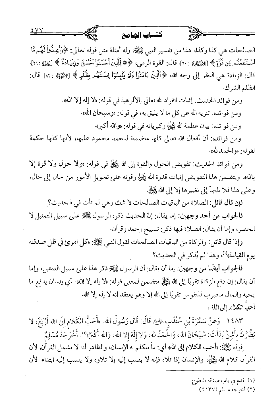 1483 - وعن سمرة بن جندبٍ رضي الله عنه قال: قال رسول الله: "أحب الكلام إلى الله أربعٌـ لا يضرك بأيهن بدأت: سبحان الله، والحمد لله، ولا إله إلا الله، والله أكبر". أخرجه مسلمٌ.