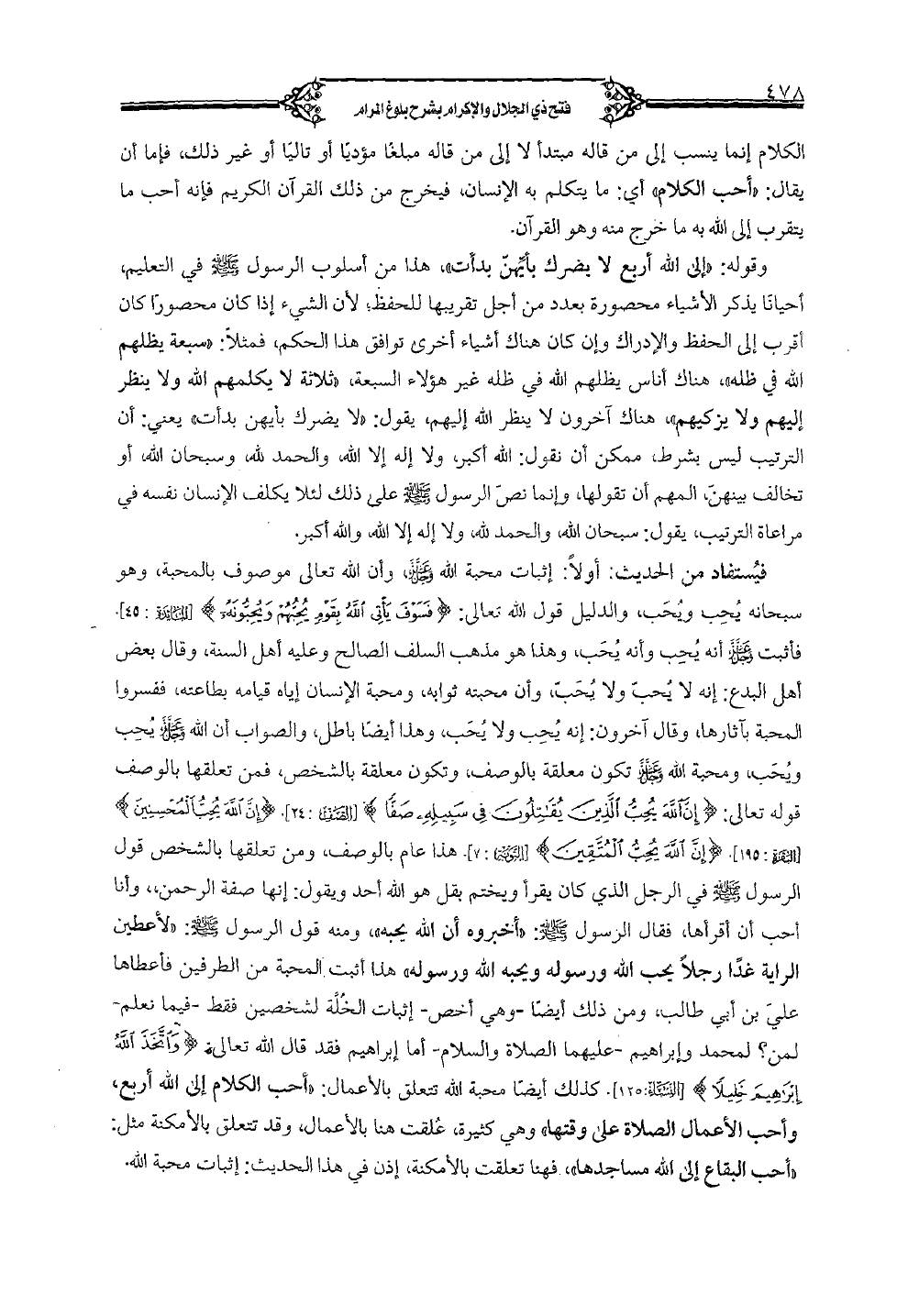 الكلام إنما ينسب إلى من قاله مبتدأ لا إلى من قاله مبلغاً مؤدياً أو تاليا غير ذلك، فإما أن يقال: "أحب الكلام" أي: ما يتكلم به الإنسان، فيخرج من ذلك القرآن الكريم فإنه أحب ما يتقرب إلى الله به ما خرج منه وهو القرآن.