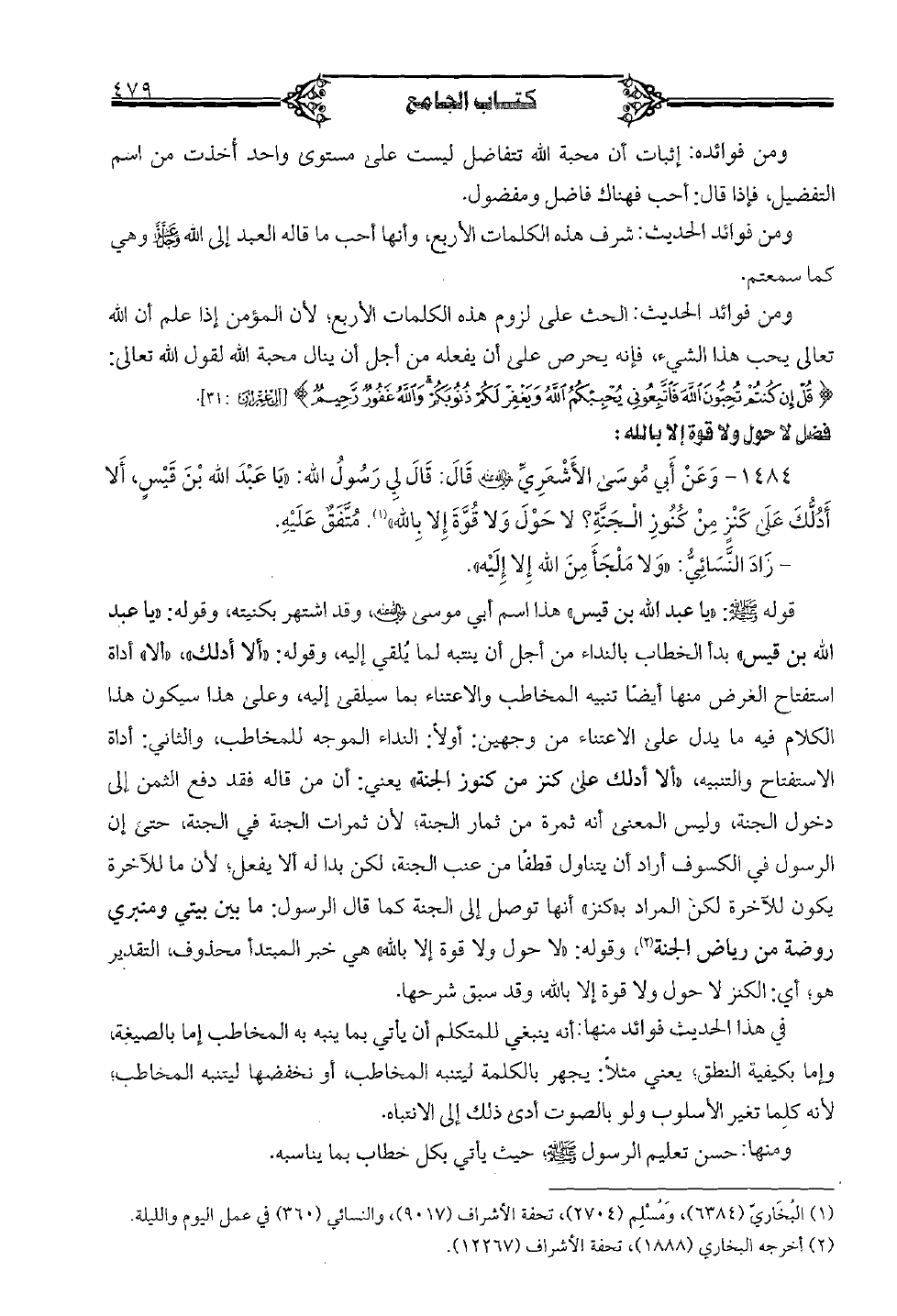 1484 - وعن أبي موسى الأشعري رضي الله عنه قال: قال لي رسول الله: "يا عبد الله بن قيسٍ، ألا أدلك على كنزٍ من كنوز الجنة؟ لا حول ولا قوة إلا بالله". متفقٌ عليه.