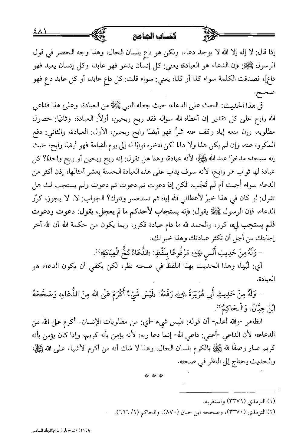في هذا الحديث: الحث على الدعاء؛ حيث جعله النبي صلى الله عليه وسلم من العبادة، وعلى هذا فداعي الله رابح على كل تقدير إن أعطاه الله سؤاله فقد ربح ربحين، أولاً: العبادة، وثانياً: حصول مطلوبه، وإن منعه إياه وكف عنه شراً فهو أيضاً رابح ربحين، الأول: العبادة، والثاني: دفع المكروه عنه، وإن لم يكن هذا ولا هذا لكن ادخره ثواباً له إلى يوم القيامة فهو أيضاً رابح؛ حيث إنه سيجده مدخراً عند الله عز وجل، لأنه عبادة، وهنا هل نقول: إنه ربح ربحين أو ربح واحداً؟ كل عبادة لها ثواب هو رابح؛ لأنه سوف يثاب على هذه العبادة الحسنة بعشر أمثالها، إذن أكثر من الدعاء سواء أجبت أم لم تجب، لكن إذا دعوت ثم دعوت ثم دعوت ولم يستجب لك هل تقول: لو كان في هذا خير لأعطاني الله إياه ثم تستحسر وتترك؟ الجواب: لا، لا يجوز، كرر الدعاء؛ فإن الرسول صلى الله عليه وسلم يقول: "إنه يستجاب لأحدكم ما لم يعجل، يقول: دعوت ودعوت فلم يستجب لي" كرر، والحمد لله ما دام عبادة فكرر، ربما يكون من حكمة الله أن الله أخر إجابتك من أجل أن تكثر عبادتك وهذا خير لك.